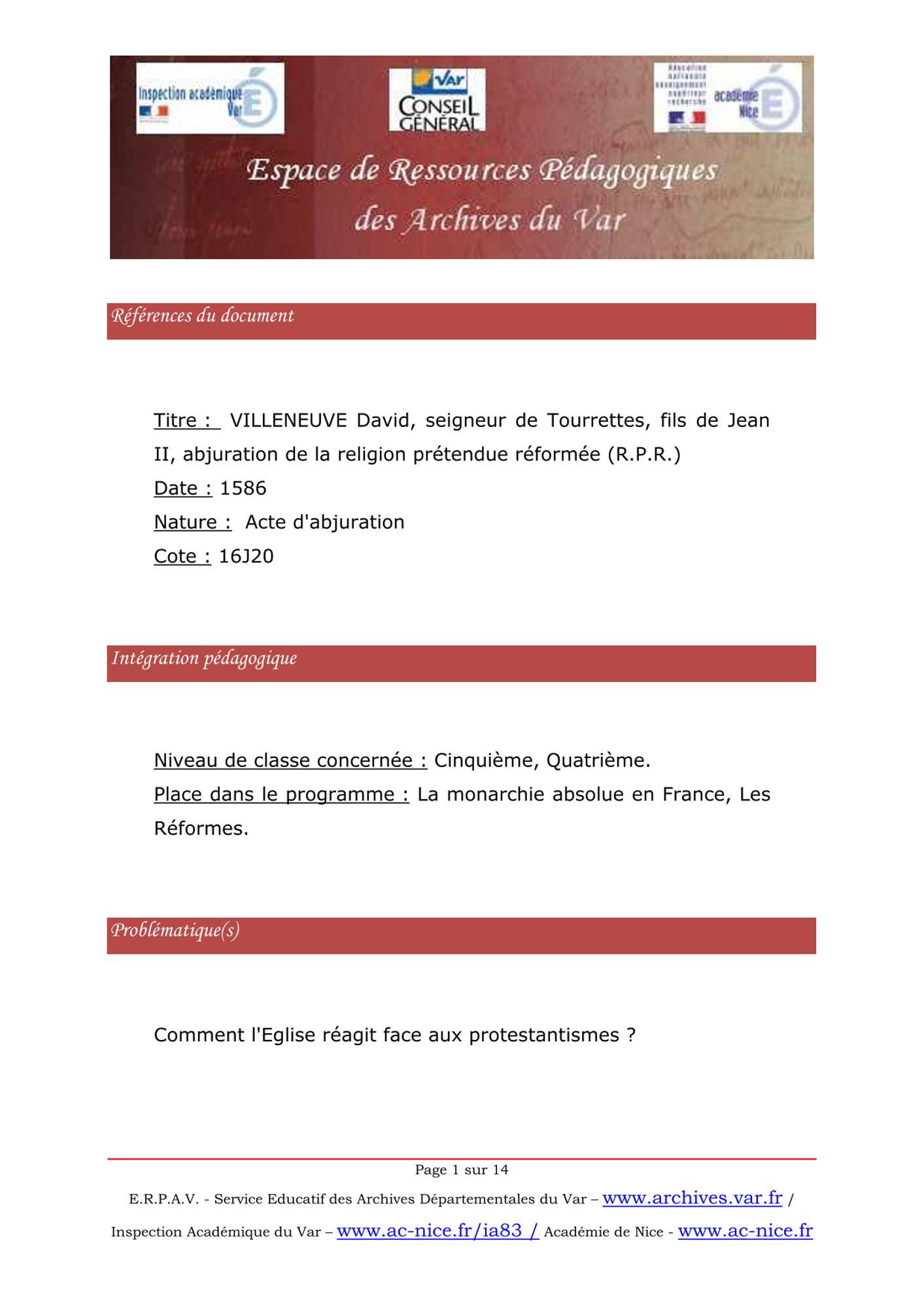 Acte d'abjuration du protestantisme par David de Villeneuve, seigneur de Tourrettes, fils de Jean II (1586)