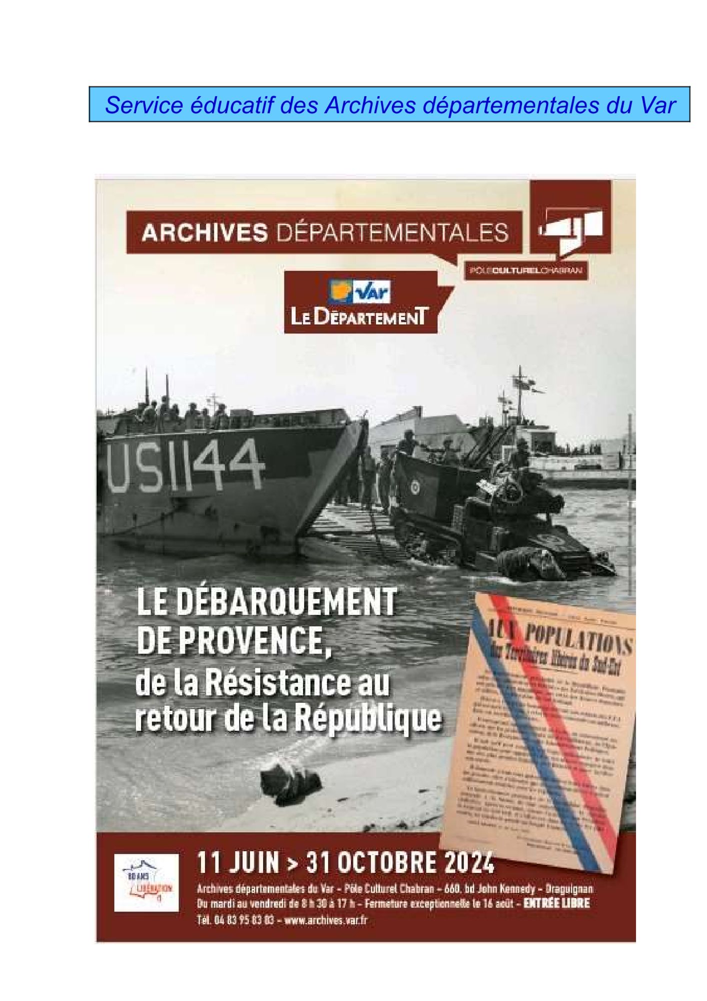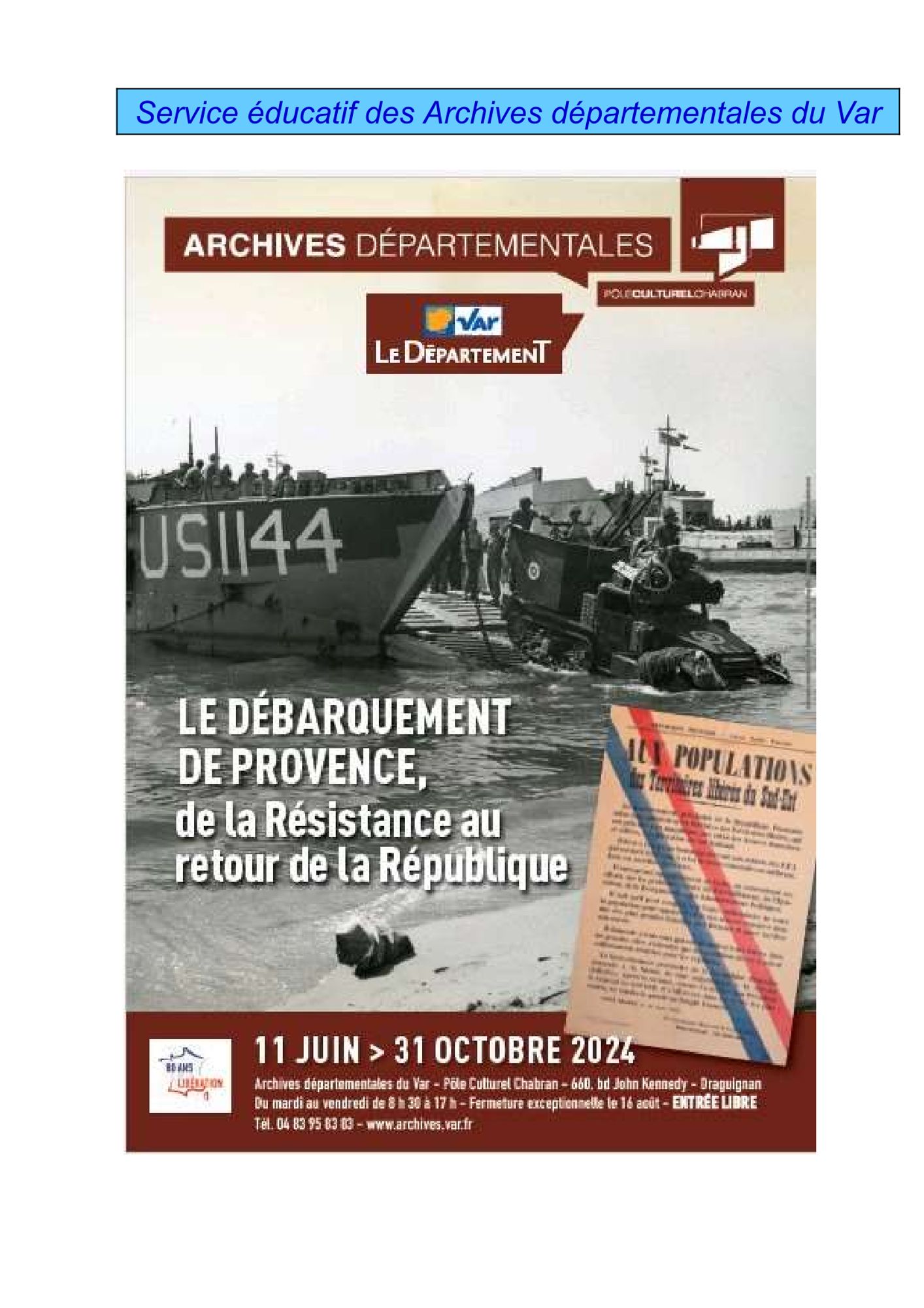 Dossier pédagogique de l'exposition "Le Débarquement de Provence, de la Résistance au retour de la République" Dossier pédagogique élèves (947.4 Ko) Dossier pédagogique enseignants (2.7 Mo)