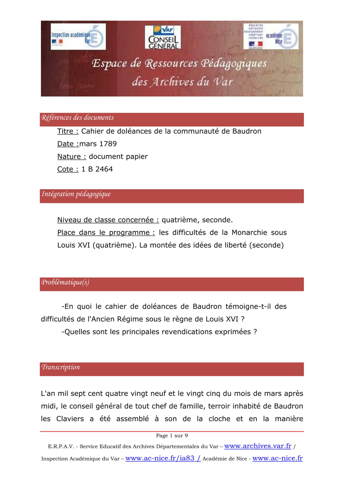 Il devait ensuite être présenté à l'assemblée de la sénéchaussée de Draguignan qui devait rédiger un seul cahier de doléances. La communauté de Baudron appartenait au canton de Bargemon. Son existence prit fin en 1791. Le fonds d'archives de cette communauté d'habitants se trouve dans les archives communales de Montferrat (E dépôt 44).