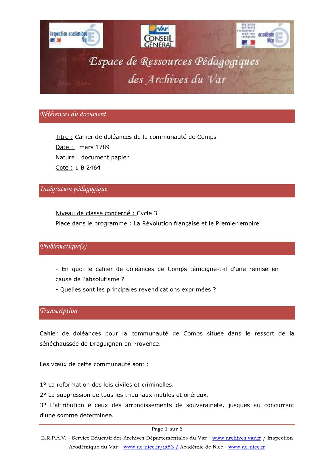 Cahier de doléances de la communauté de Comps Ce document a été rédigé par les représentants des habitants de la communauté de Comps. 1 5 2 5 3 5 4 5 5 5 Il devait ensuite être présenté à l'assemblée de la sénéchaussée de Draguignan qui devait rédiger un seul cahier de doléances. Copyright Archives départementales du VarPhotographies : Jérôme Pélissier Pistes pédagogiques : Pistes pédagogiques - Cycle 3 (87.1 Ko)