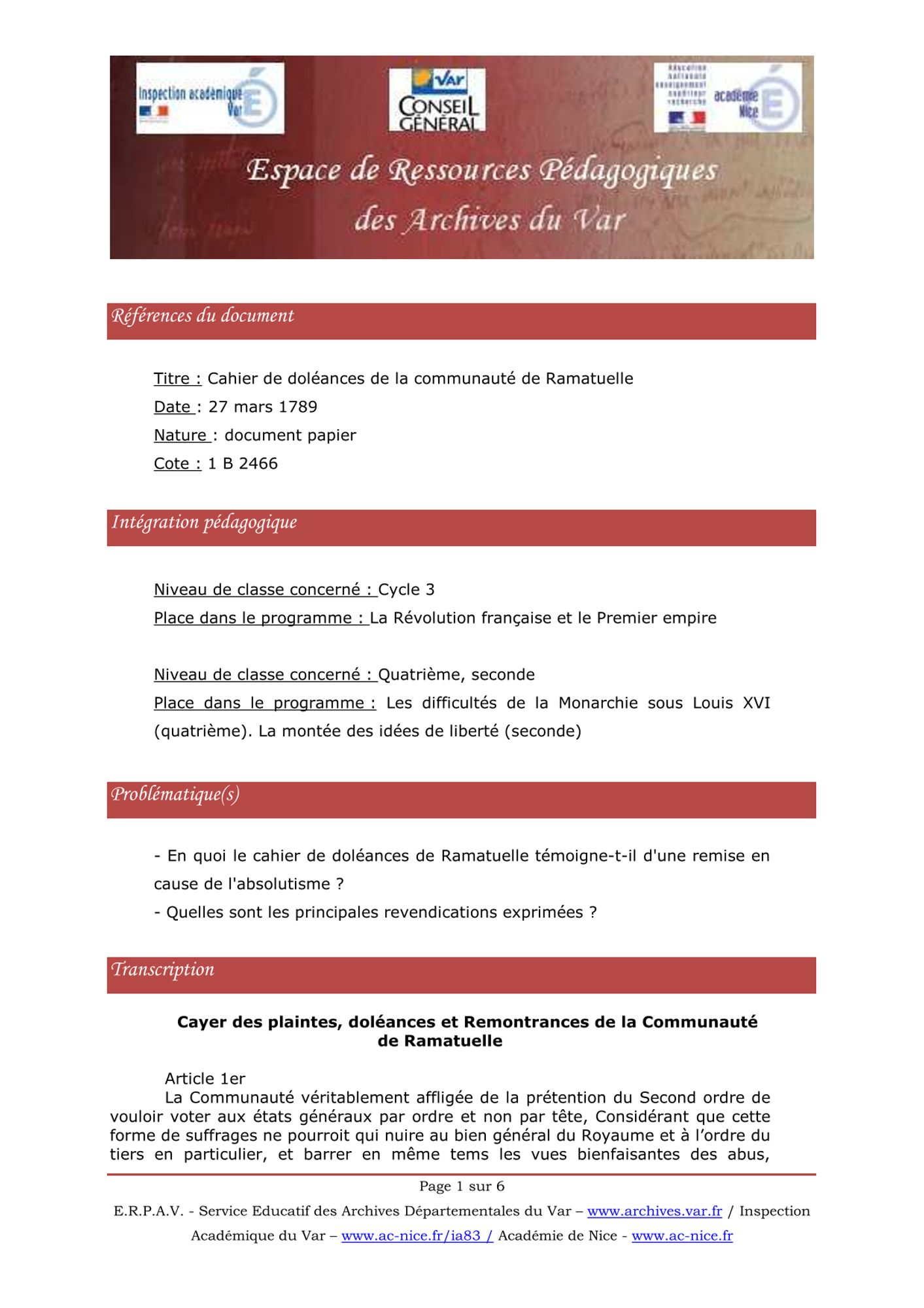 Ce document composé de 7 feuillets a été rédigé par les représentants des habitants de la communauté de Ramatuelle.