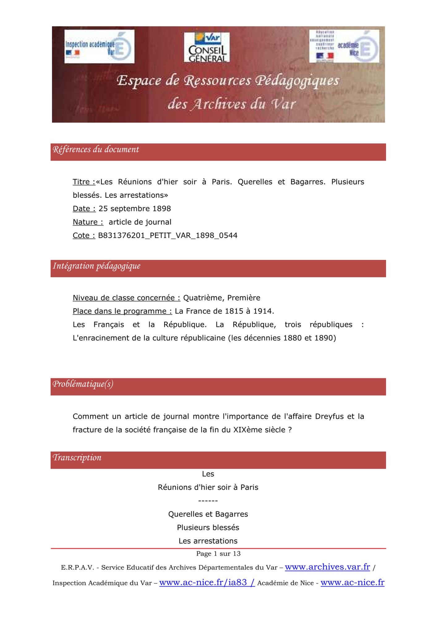 L'article du « Petit Var » relate une manifestation entre dreyfusards (dreyfusistes…) et antidreyfusards (antidreyfusistes…) à Paris peu de temps après l'incarcération de Marie-Georges Picquart. Il illustre les violences et les passions déchaînées par l'affaire Dreyfus .
