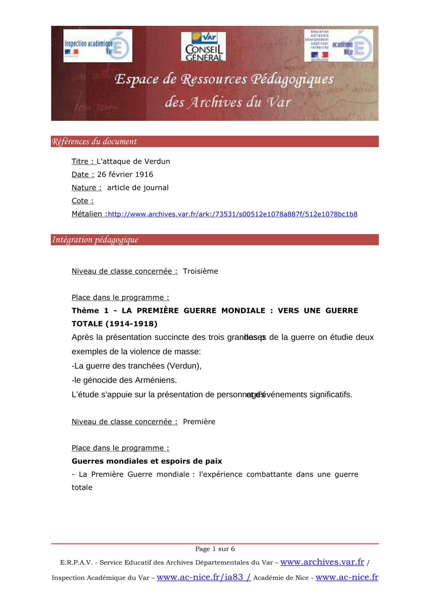 Article du journal "Le Petit Var" intitulé "L'attaque de Verdun" Fiche pédagogique sur l'article du Petit Var relatant l'attaque de Verdun (26 février 1916) (154.2 Ko)