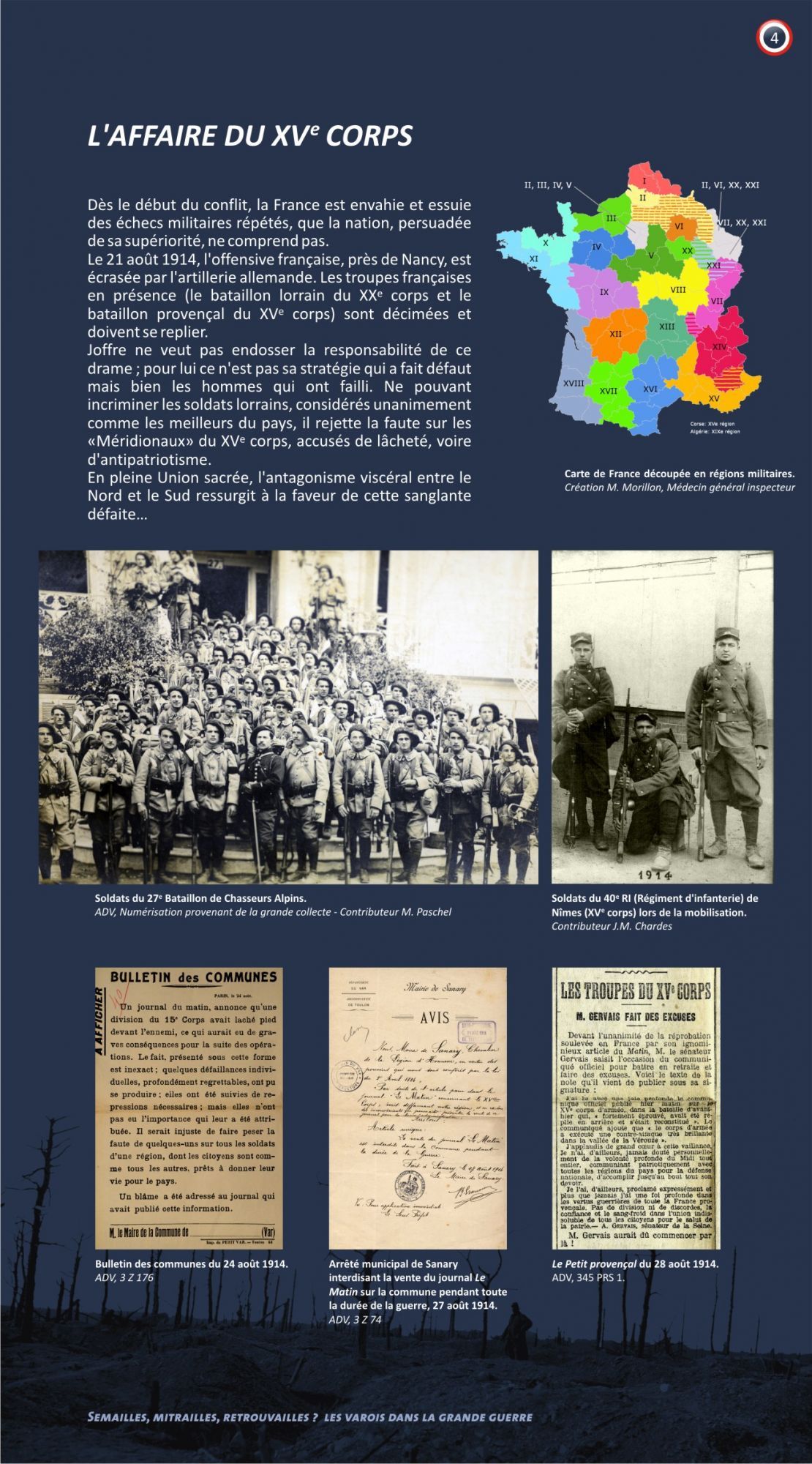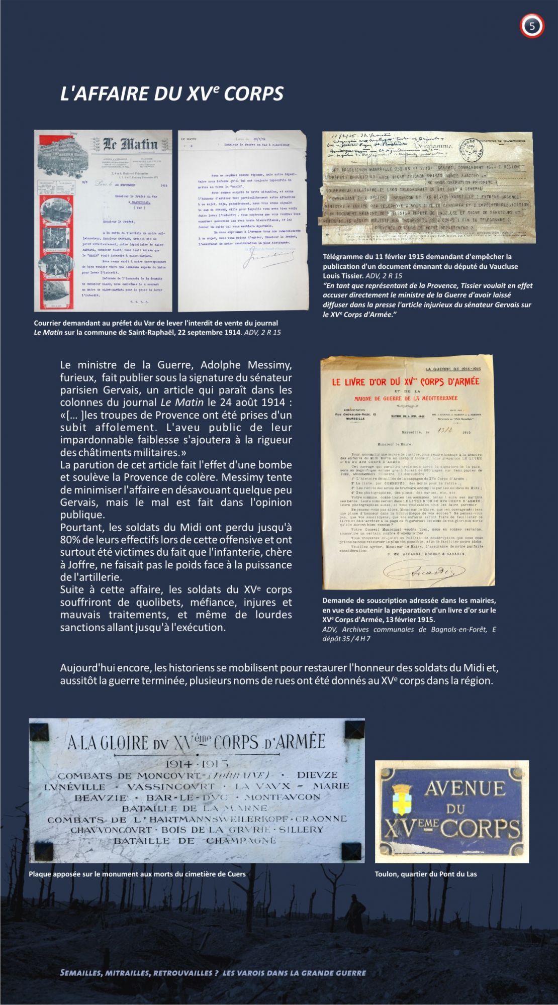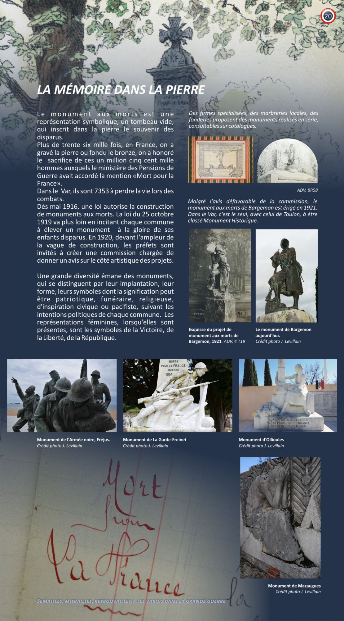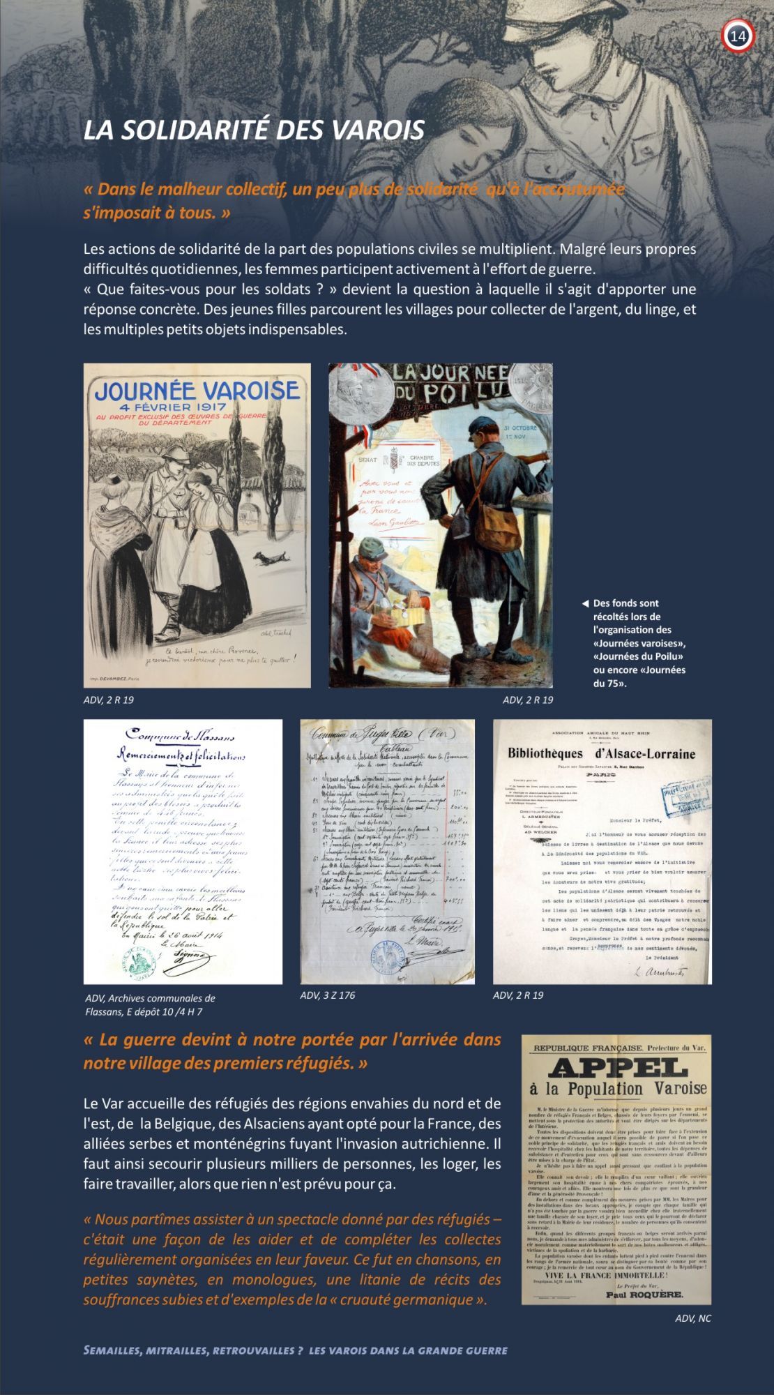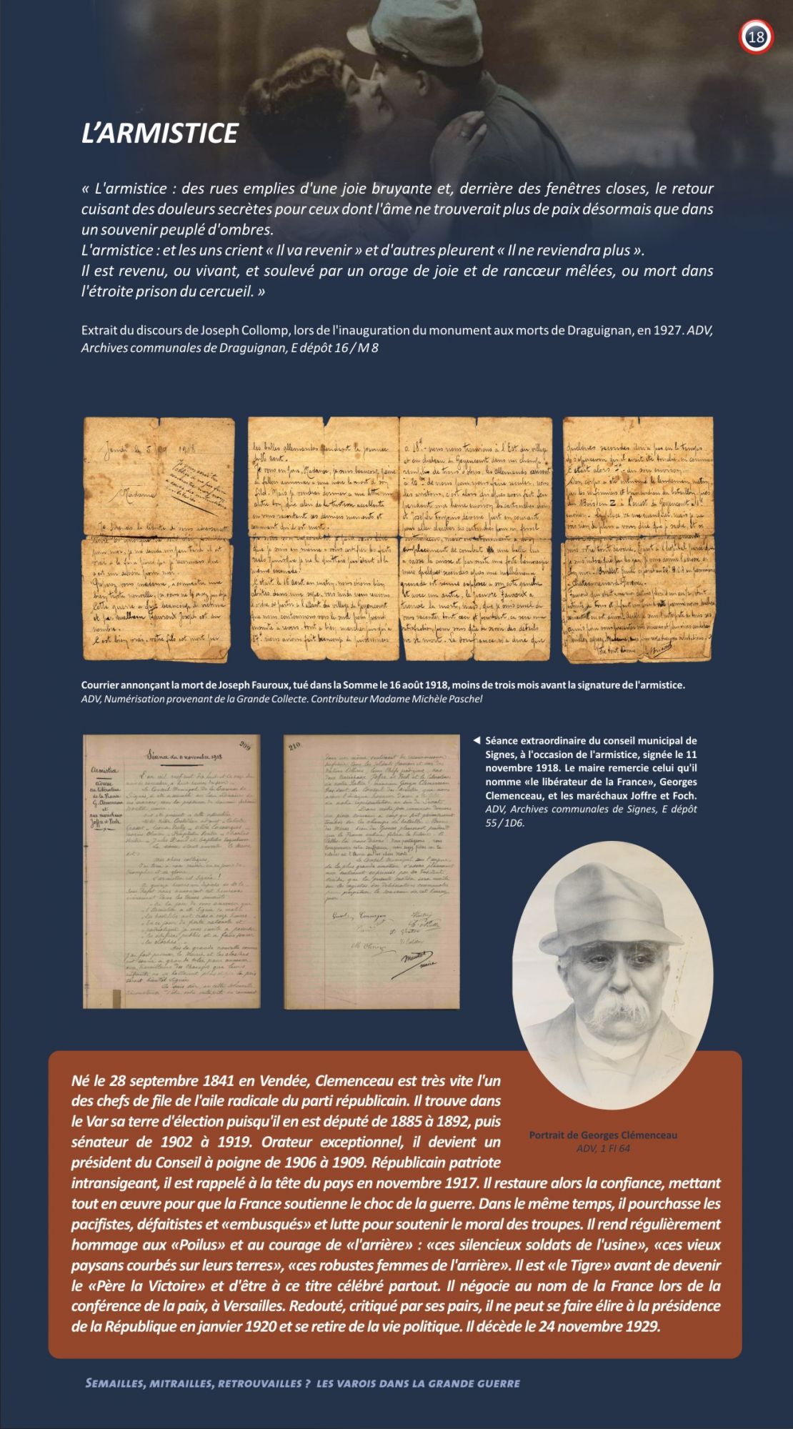 Cette exposition commémorative de la Grande Guerre, qui a reçu le label «Centenaire 1914-1918», est coproduite par les Archives départementales du Var et le Musée des Arts et Traditions Populaires de Draguignan, en partenariat avec le musée de l’Artillerie de Draguignan, le musée d’Art et d’Histoire de Draguignan, le musée des Gueules Rouges de Tourves et le musée du moyen Verdon de Castellane.