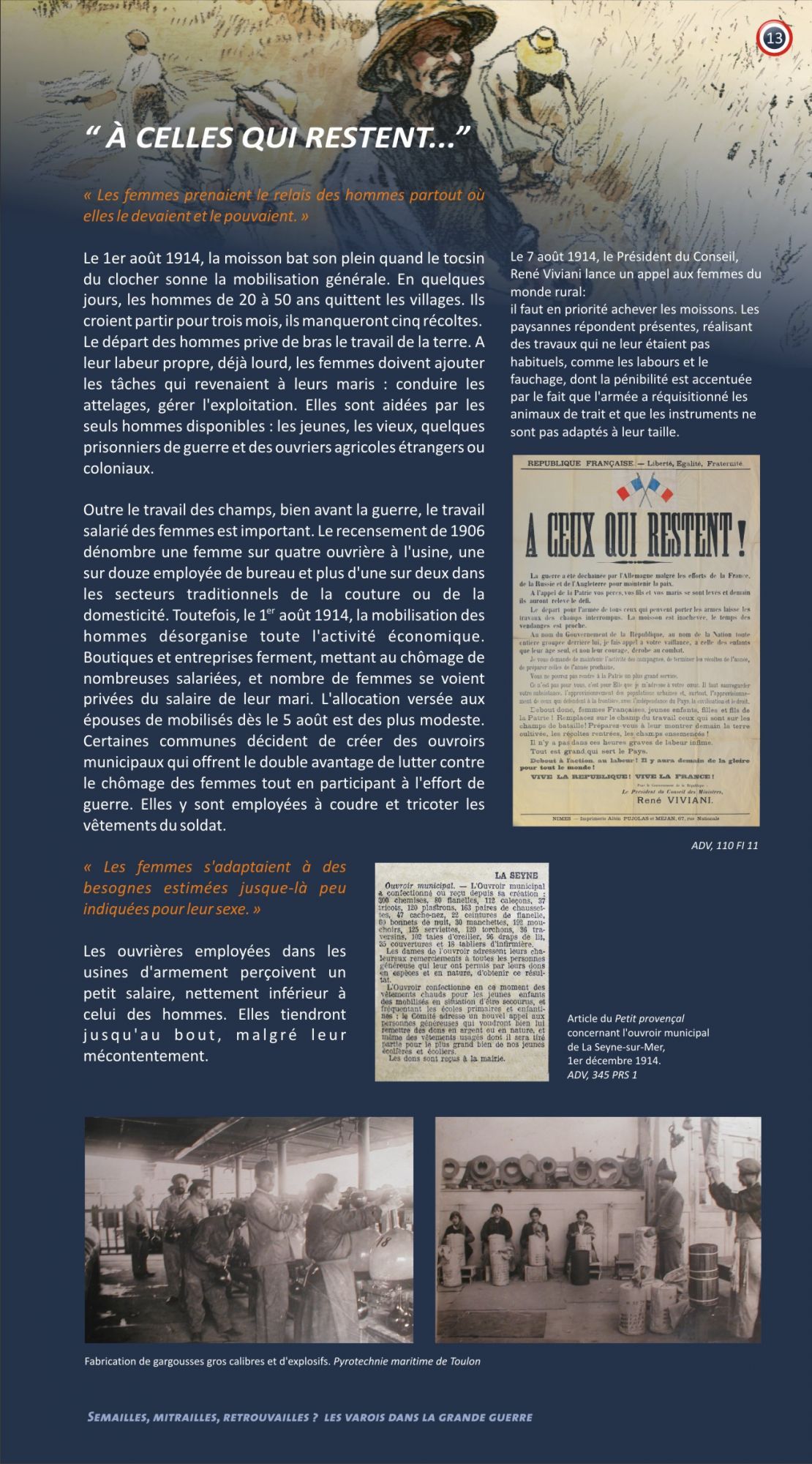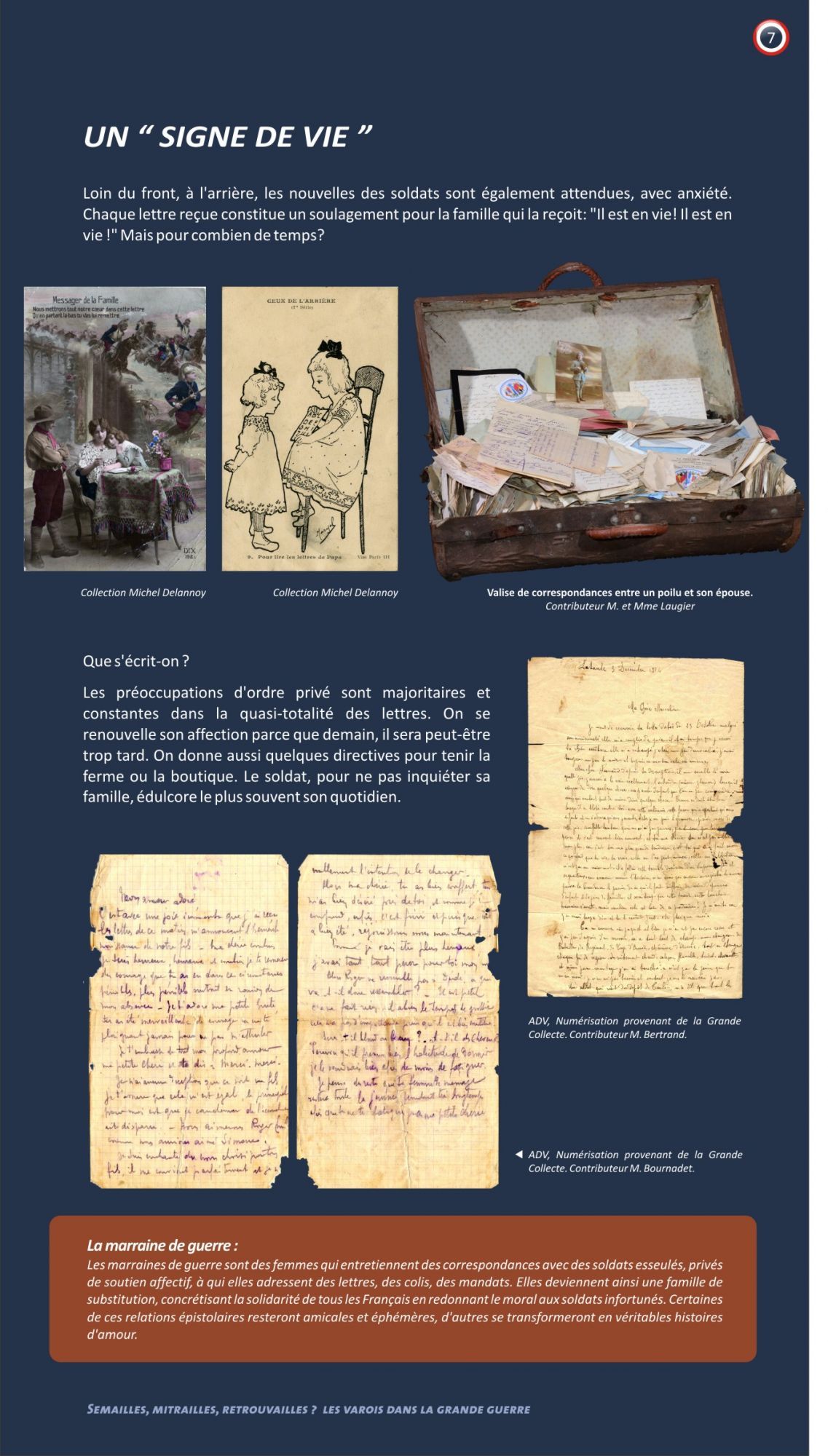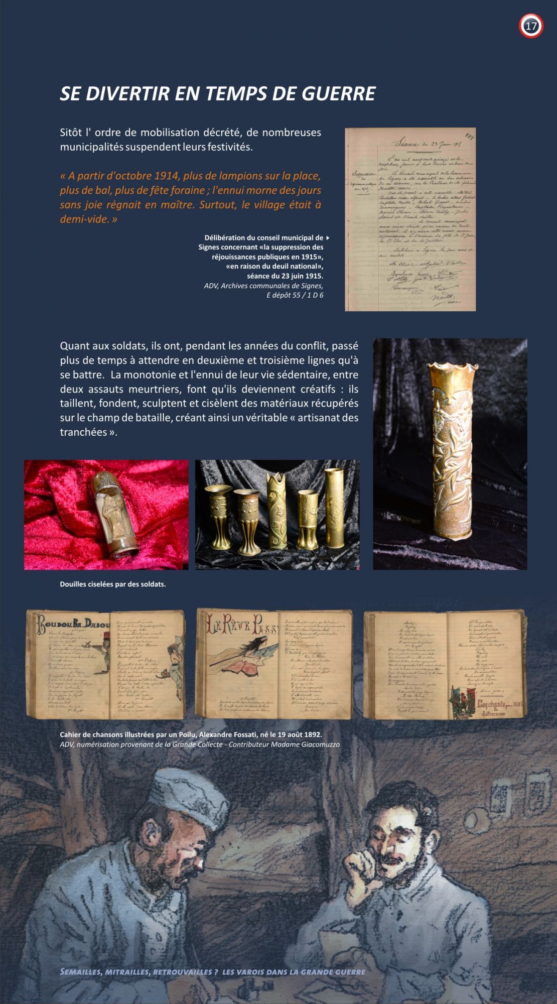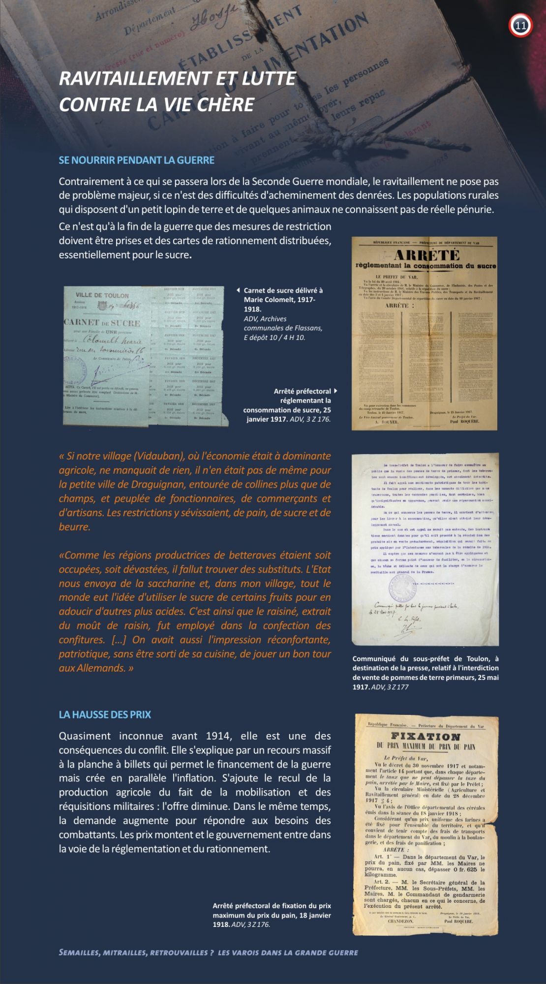 2 – animation du parcours permanent du musée des ATP, en illustrant la vie des Varois à l’arrière à partir de correspondances, de documents d’archives, de documents graphiques et photographiques. Objectif : apporter un éclairage spécifique sur la vie quotidienne et les activités au début du 20ème siècle et montrer comment les Varois se sont organisés pendant cette période de guerre. Les compléments d’information qui se trouveront dans ce parcours resteront dans l’espace jusqu’en 2018.