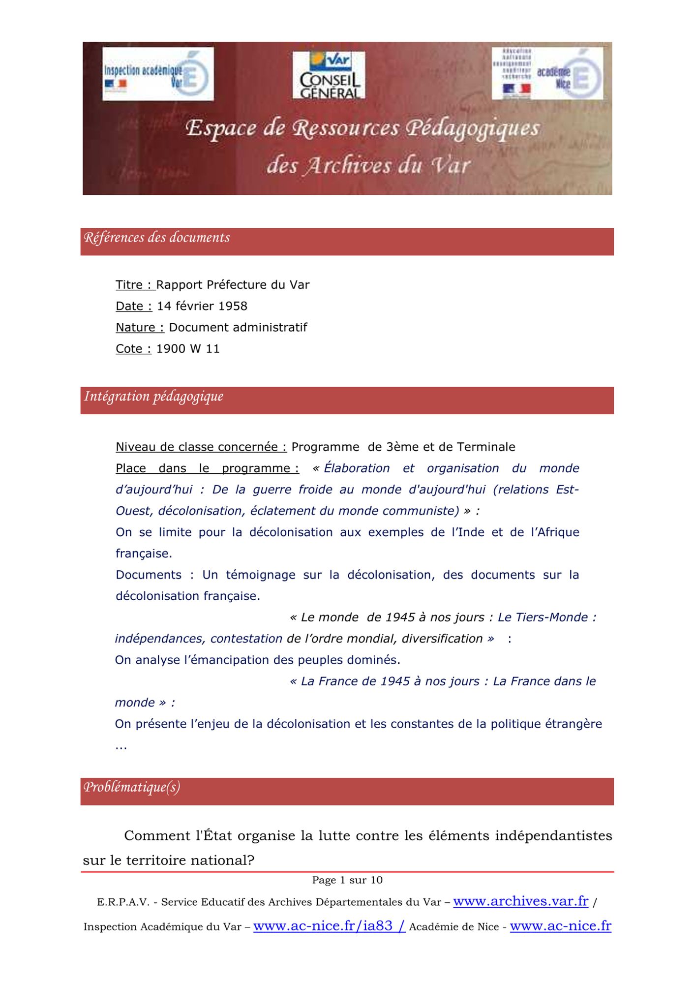 Rapport des Renseignements Généraux sur le séparatisme algérien à Toulon 1 5 2 5 3 5 4 5 5 5 Ce rapport, datant de 1958, détaille les activités ainsi que les différents mouvements séparatistes algériens. Copyright Archives départementales du VarPhotographies : Jérôme Pélissier Pistes pédagogiques - Troisième, Terminale (125.5 Ko)