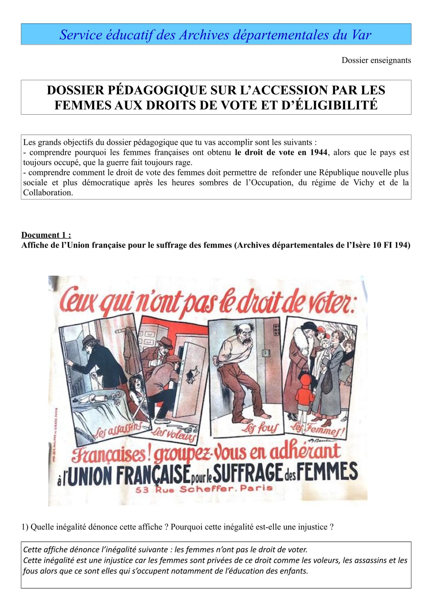 Dossier pédagogique sur l'accession par les femmes au droit de vote et d'éligibilité dans le Var à partir d'exemples et de documents locaux
