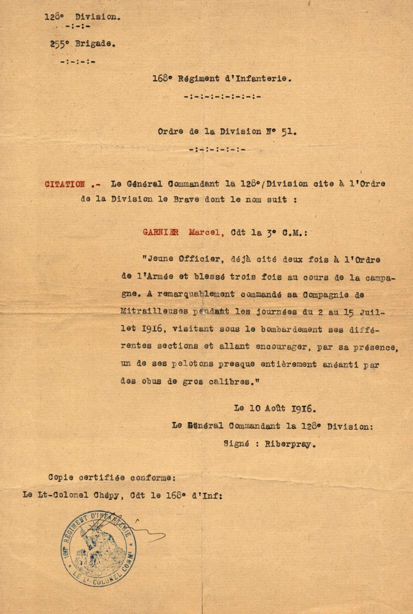 Chevalier de la Légion d'Honneur depuis 1919, plusieurs fois cité, blessé de guerre, Marcel Garnier est un Saint-Cyrien de 1914. Il a connu les tranchées puisque, pendant 3 ans, il commanda un compagnie d'infanterie sur les fronts d'Argonne, de Verdun et de Champagne. Puis, en novembre 1917, il fut affecté sur sa demande dans l'aviation de bombardement de nuit en qualité de capitaine observateur. Il fut abattu en combat aérien et fait prisonnier en septembre 1918.