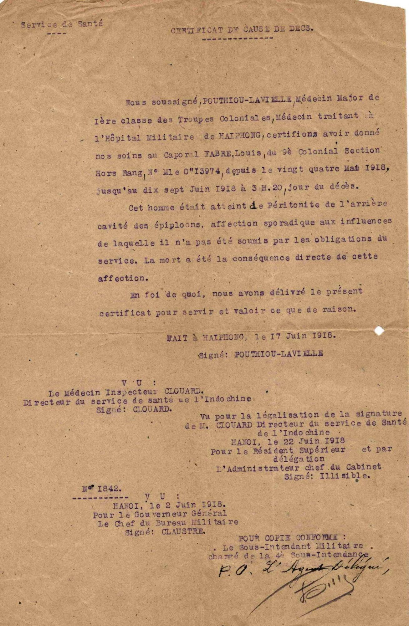 Le 17 janvier, il est averti par dépêche de la naissance de sa fille Denise Fabre. Au cours de cette année, il projette de faire venir sa femme et ses enfants en Indochine et de s’y installer.