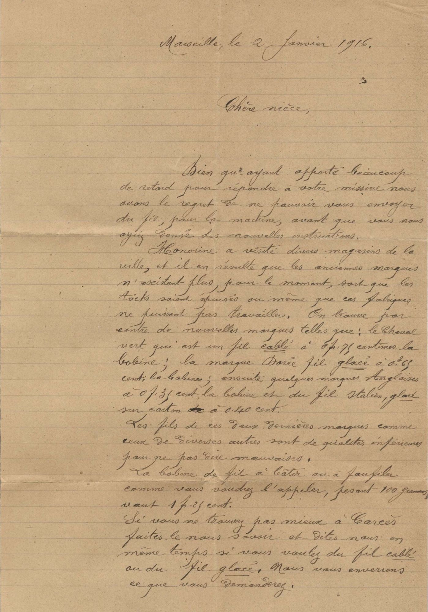 Je vais te donner encore un peu de mes nouvelles. Je suis toujours en très bonne santé et je désire qu’il en soit de même pour toi et toute la maison. Quand tu m’écriras, tu me diras un peu ce que vous faites là-bas. Je pense que vous devez avoir du travail. Mais ce que je te recommande de bien manger et bien boire et faites toujours bien courage parce que moi je fais la même chose.