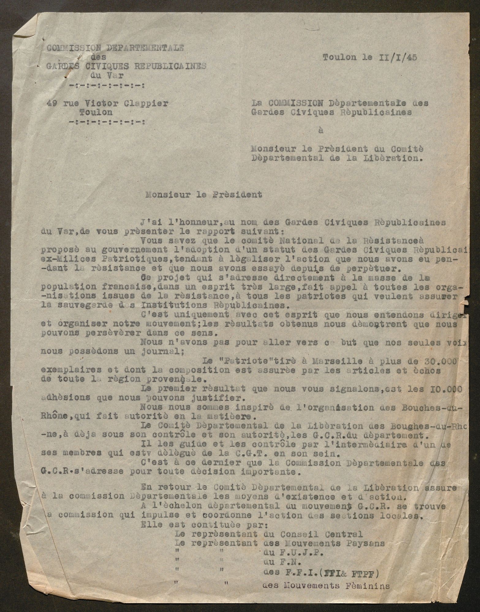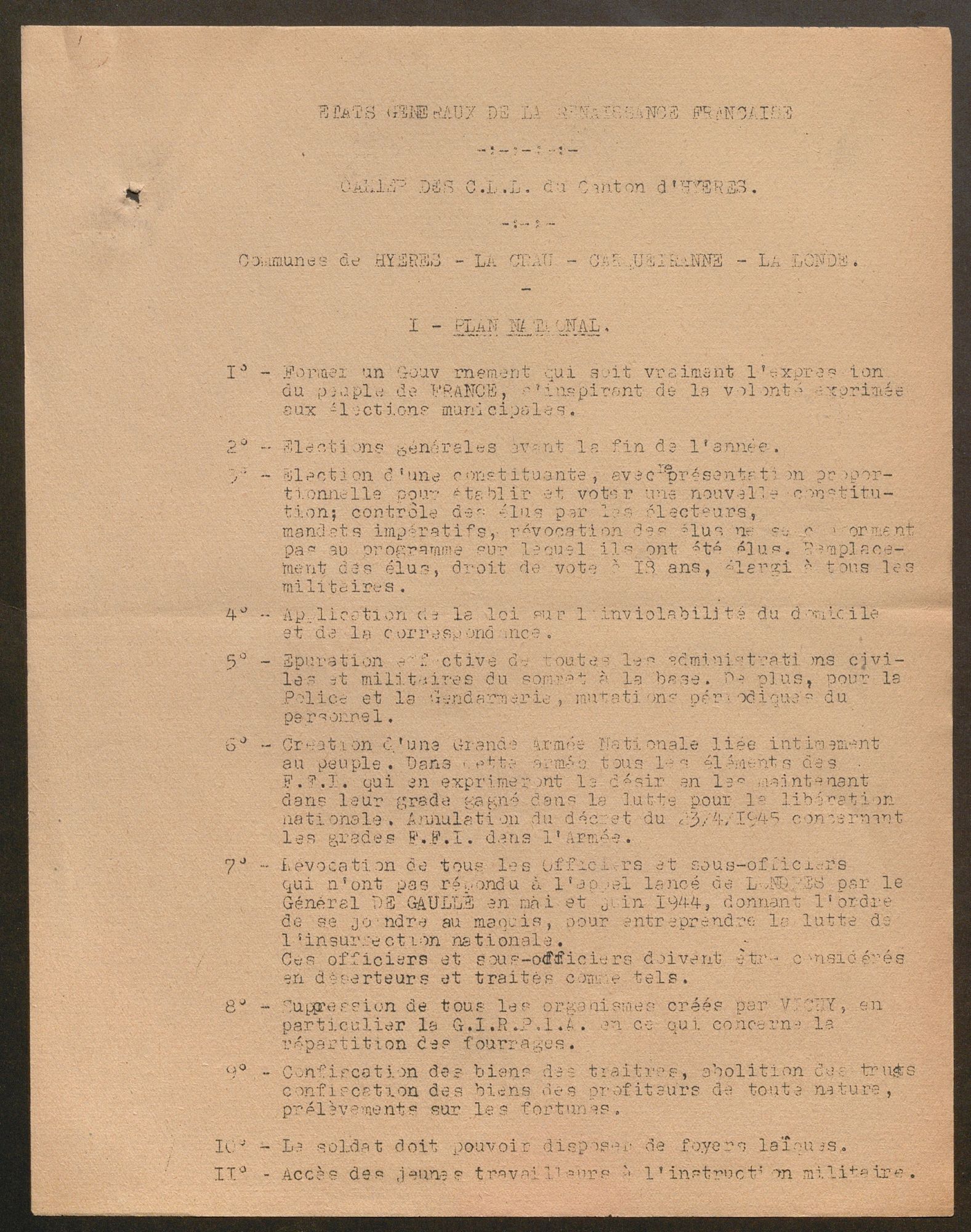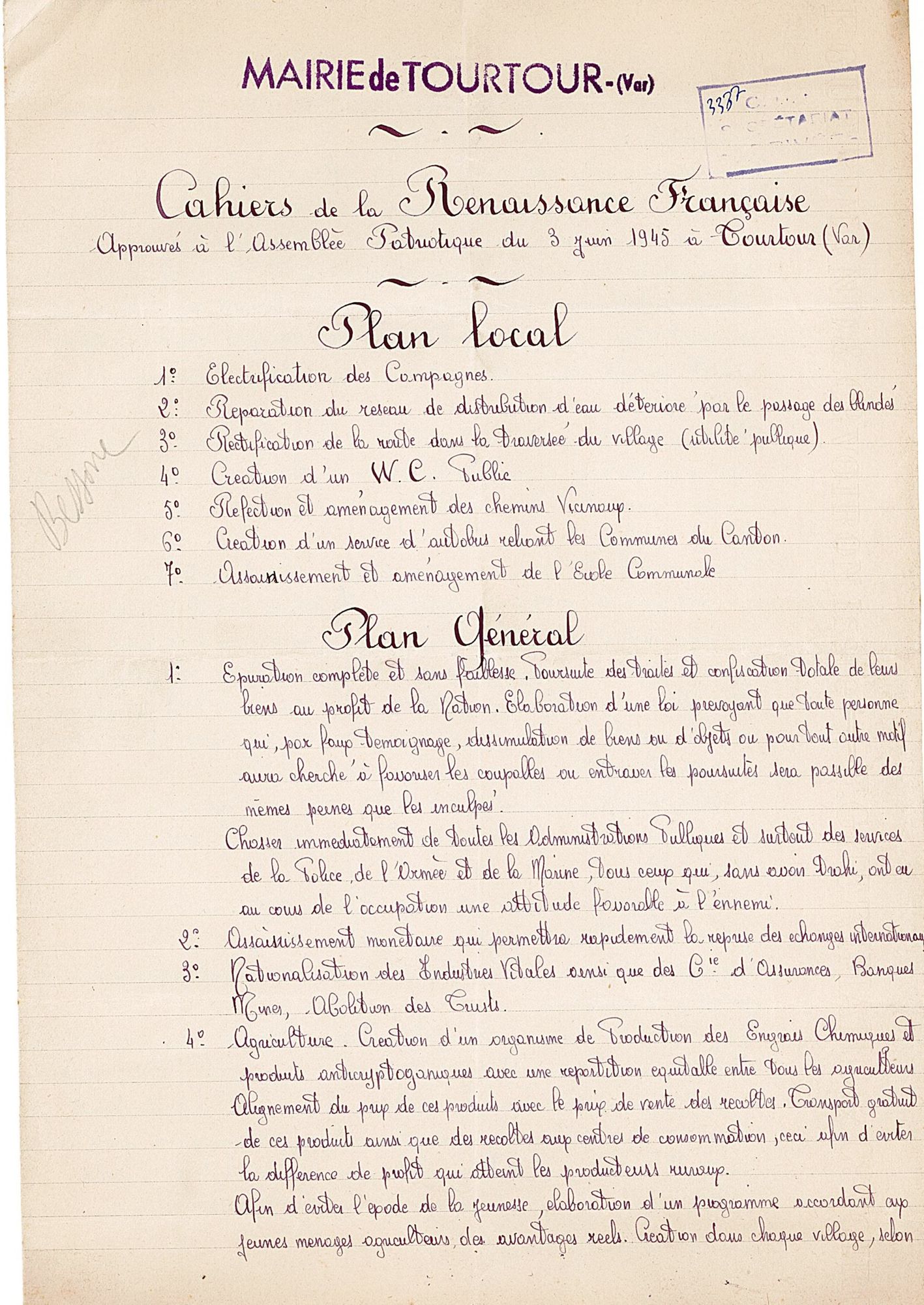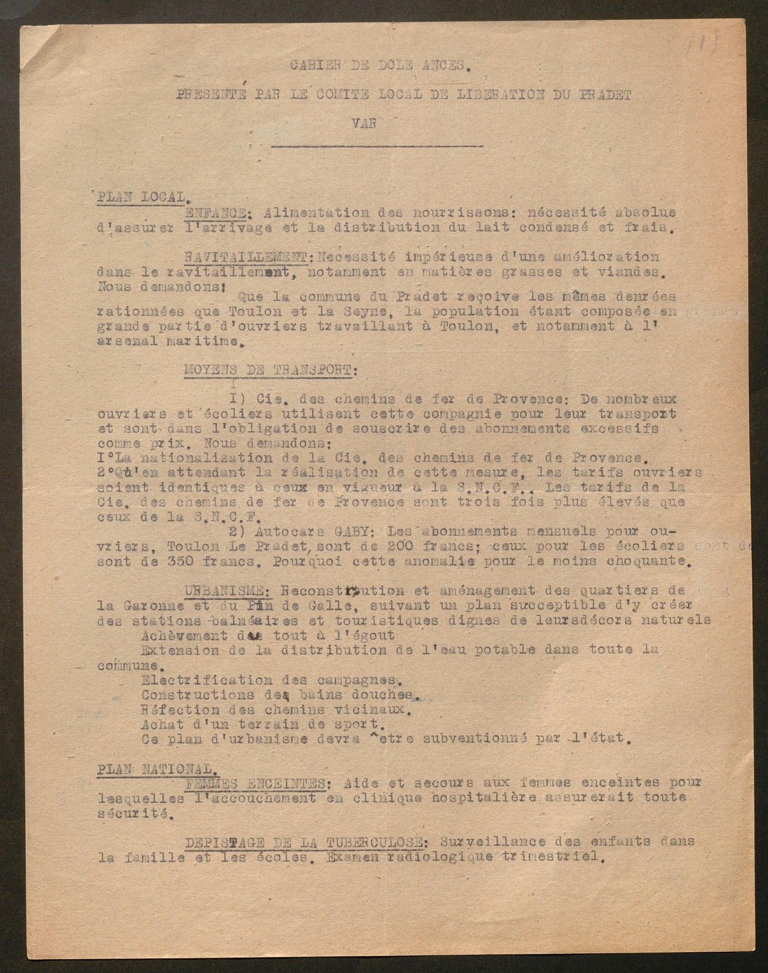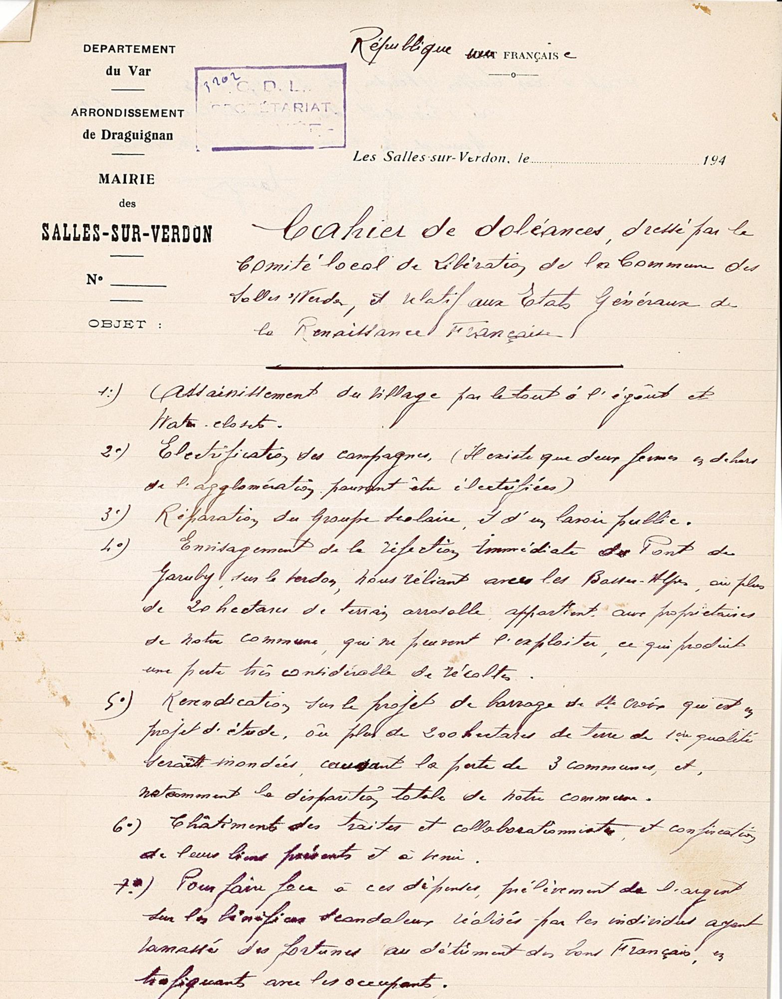 La première vague de textes est suscitée par la convocation par le CNR, à l’Hôtel de Ville de Paris, de « l’assemblée nationale des comités départementaux de la Libération », les 15 et 16 décembre 1944. Le CDL du Var invite, le 10 novembre, les comités locaux de libération (CLL) à se rendre au congrès qui aura lieu à Draguignan les 9 et 10 décembre et qui, entre autres objectifs, désignera trois délégués qui porteront une synthèse des « doléances » locales à Paris. Les CLL doivent donc réunir la population de leur commune pour lui présenter le programme du CNR et rassembler ses vœux. En dépit d’un contexte difficile et d’un délai court, 43 communes au moins fournissent les « cahiers de doléances » demandés. La plupart des assemblées souvent qualifiées de « patriotiques » ou « populaires » se tiennent entre le 6 et 9 décembre. Le CLL de Ginasservis précise que la sienne s’est tenue dans la salle de la mairie à 21 heures le 7. À La Môle, la « réunion patriotique » a rassemblé « la plus grande partie de la population » et, à Collobrières, 500 personnes, « chiffre record obtenu dans notre commune à ce jour », d’après le CLL. À Ramatuelle, le cahier est signé par plus de 80 personnes le 8 décembre. Au total, plus de 80 « cahiers » – en fait des feuillets de une à trois pages – ont été transmis au CDL.