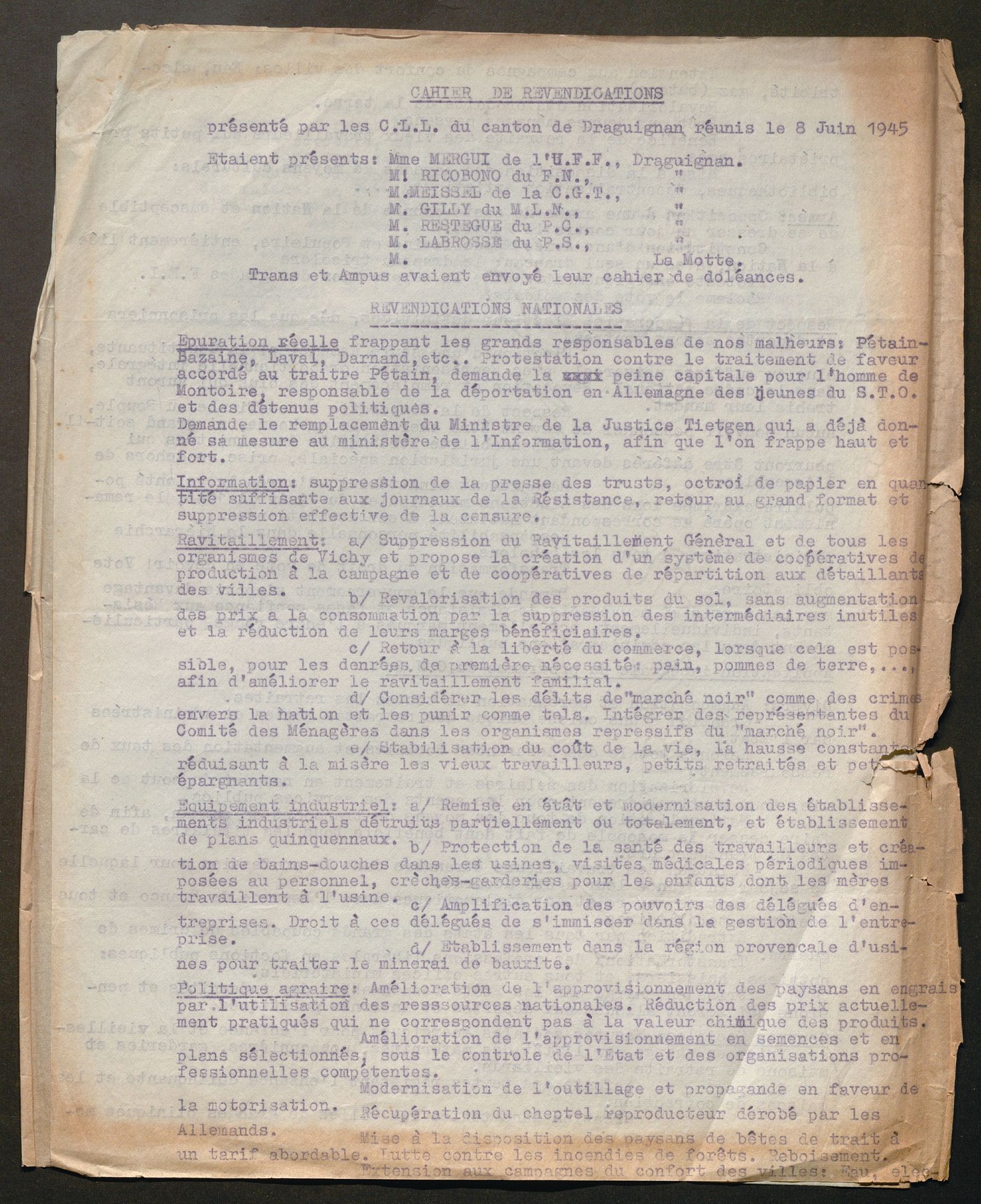 Les trois cents délégués de l’assemblée réunis à Draguignan peu après la rédaction de ces cahiers ne discuteront guère de ces vœux. En fait, les discussions portent surtout sur l’épuration, la lutte contre la « cinquième colonne » et le ravitaillement, et elles laissent transparaître sur ce dernier point les ressentiments anti-paysans des populations urbaines.