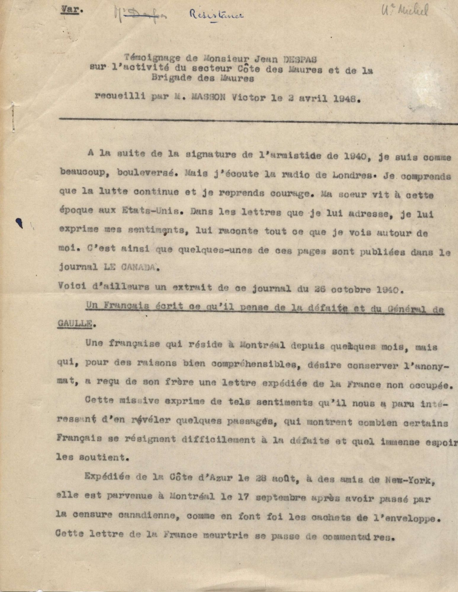 Témoignage du résistant Jean Despas Témoignage du résistant Jean Despas, qui forme le groupement des résistants "Les sans culottes", recueilli par Victor Masson en 1944 18