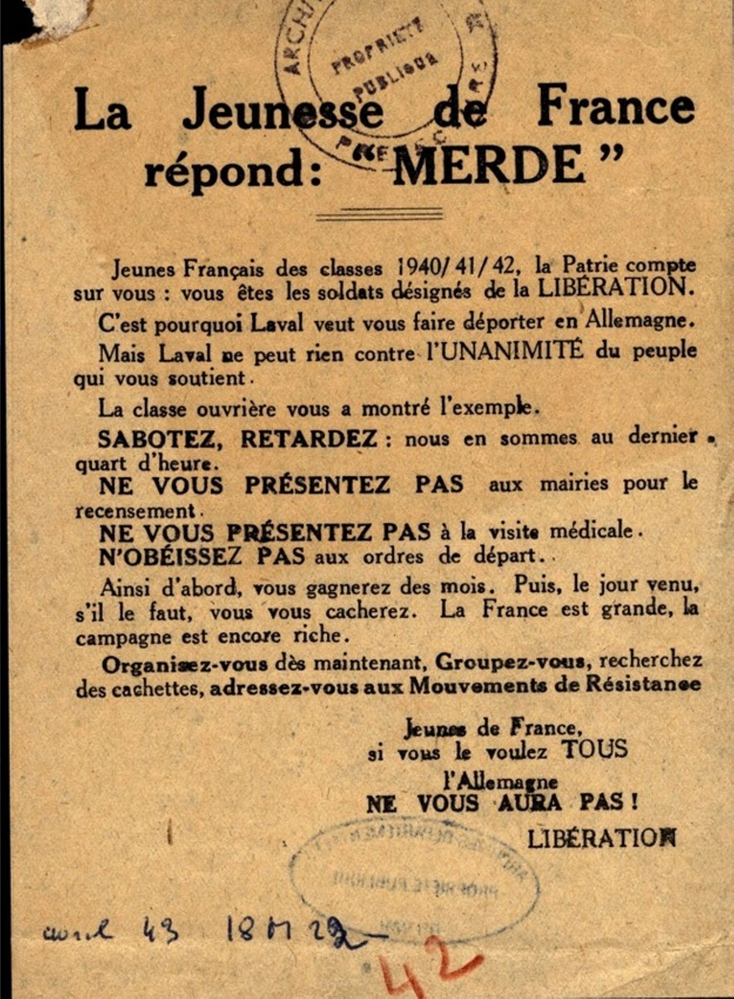 Tract de la Résistance intitulé : la jeunesse de France répond "Merde" issu du fonds de la préfecture du Var