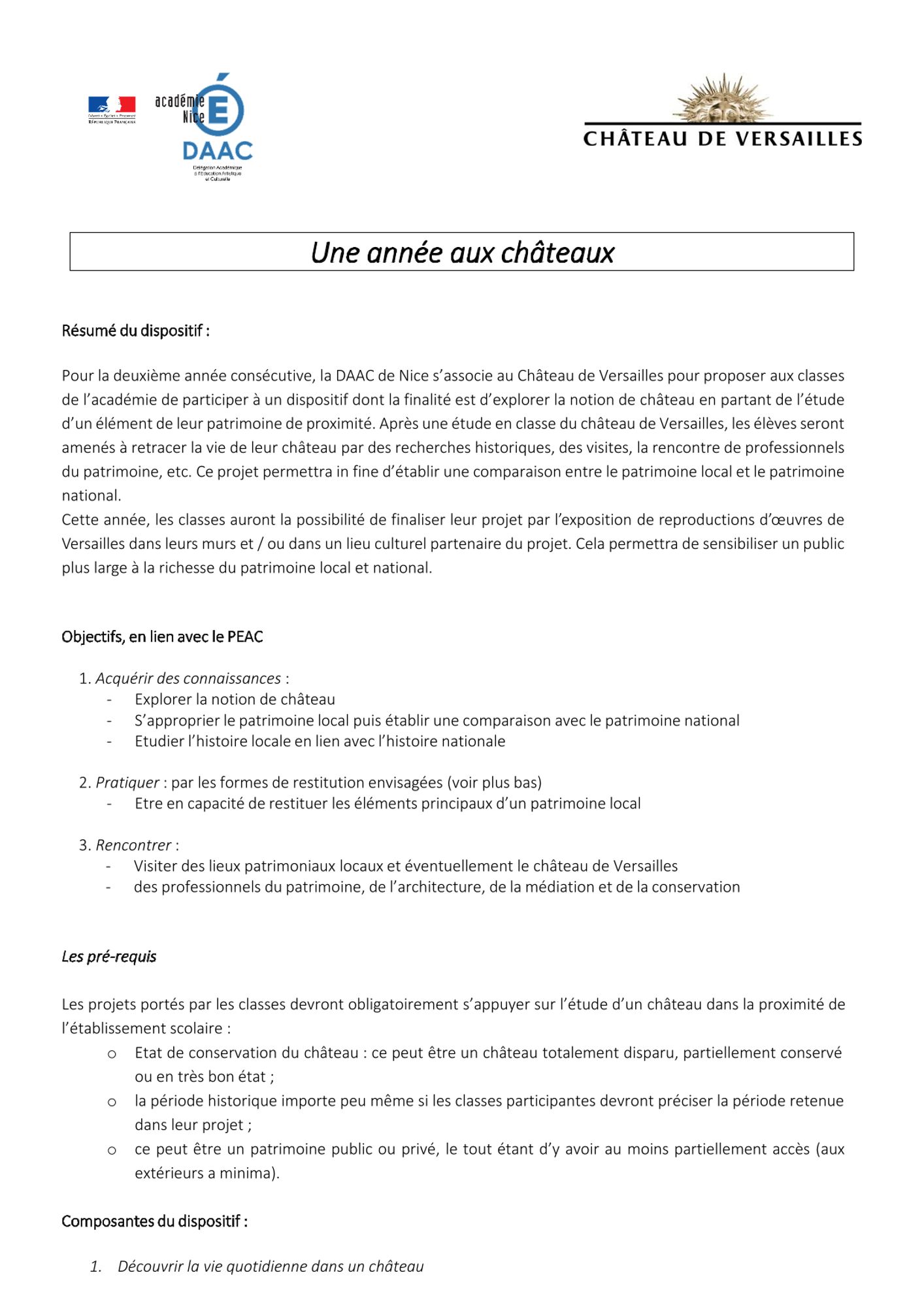 Concours Château de Versailles Les classes concourent pour faire connaître la vie des habitants d'un château proche de l'établissement. concours Une année au château (179.2 Ko)