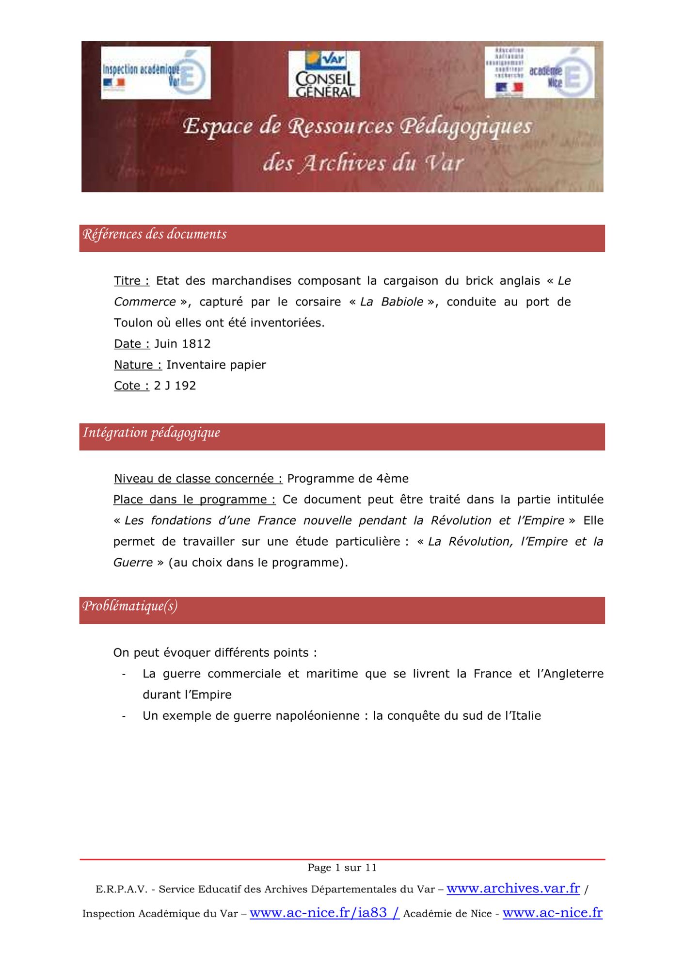 Ce document permet d’évoquer un exemple de la guerre économique que se livrent France et Angleterre par le biais de la guerre de course. On peut aussi travailler sur un exemple de conquête napoléonienne car les effets militaires capturés sur le brick anglais devait servir aux troupes anglaises stationnées en Calabre et Sicile en lutte avec les troupes françaises.