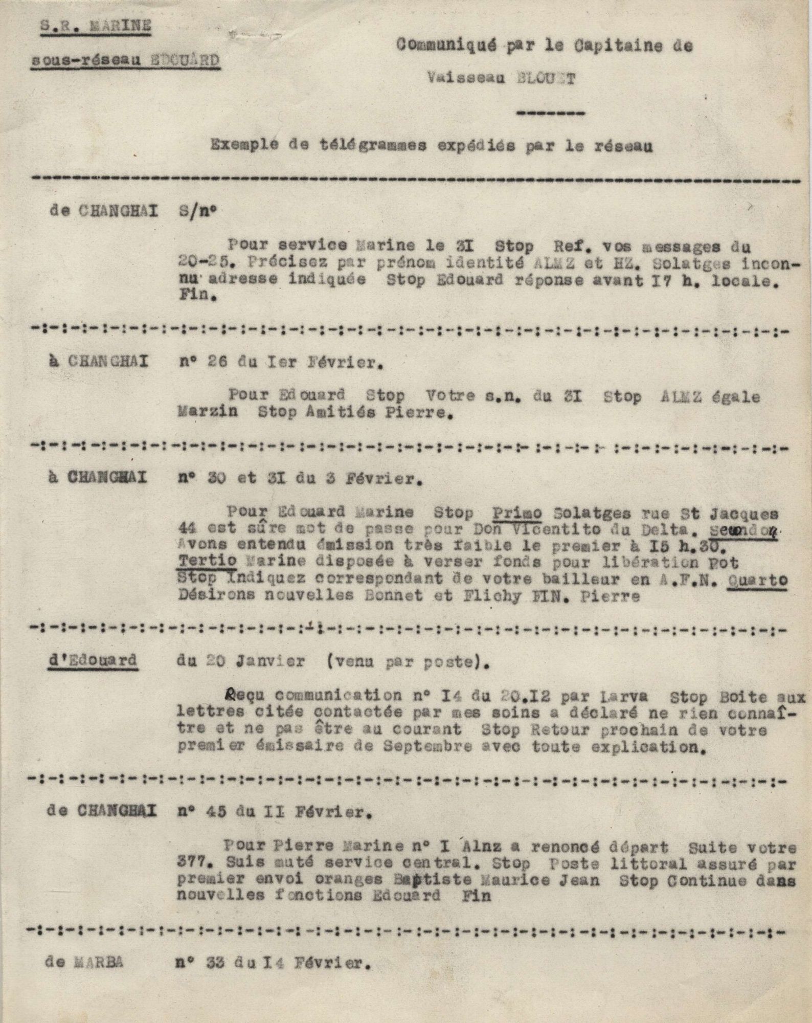 Exemples de télégrammes expédiés par le sous-réseau Edouard dépendant du SR MARINE Télégrammes communiqués par le Capitaine de Vaisseau Jacques Edouard Blouet. Exemples de télégrammes expédiés par le sous-réseau Edouard dépendant du SR MARINE 12