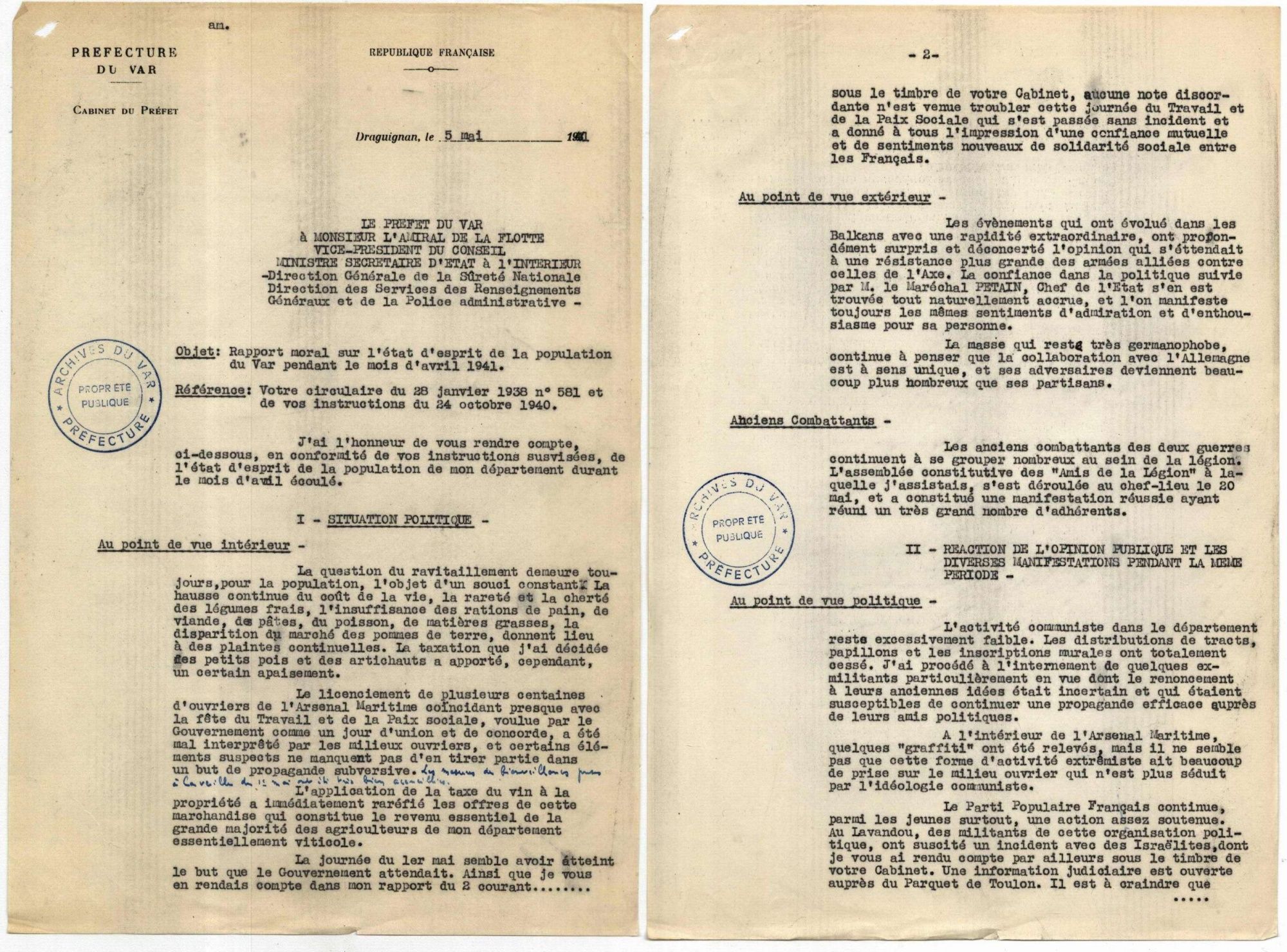 Rapport du préfet du Var au ministre de l'Intérieur sur la situation morale du département du Var en avril 1941 Rapport du préfet du Var au ministre de l'Intérieur sur la situation morale du département du Var en avril 1941 34