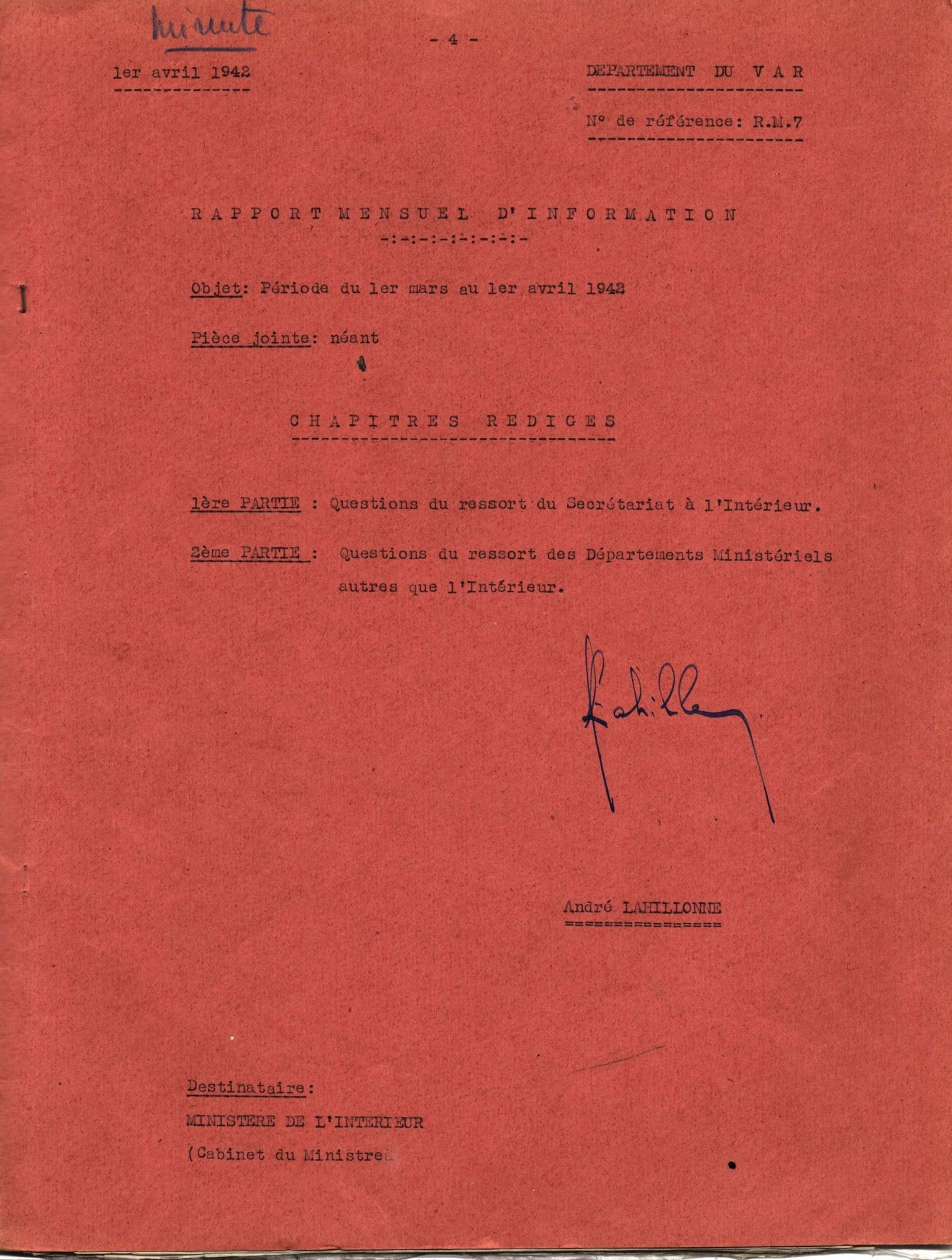 Rapport du préfet du Var au ministre de l'Intérieur sur la situation morale du département du Var en mars 1942 Rapport du préfet du Var au ministre de l'Intérieur sur la situation morale du département du Var en mars 1942 41