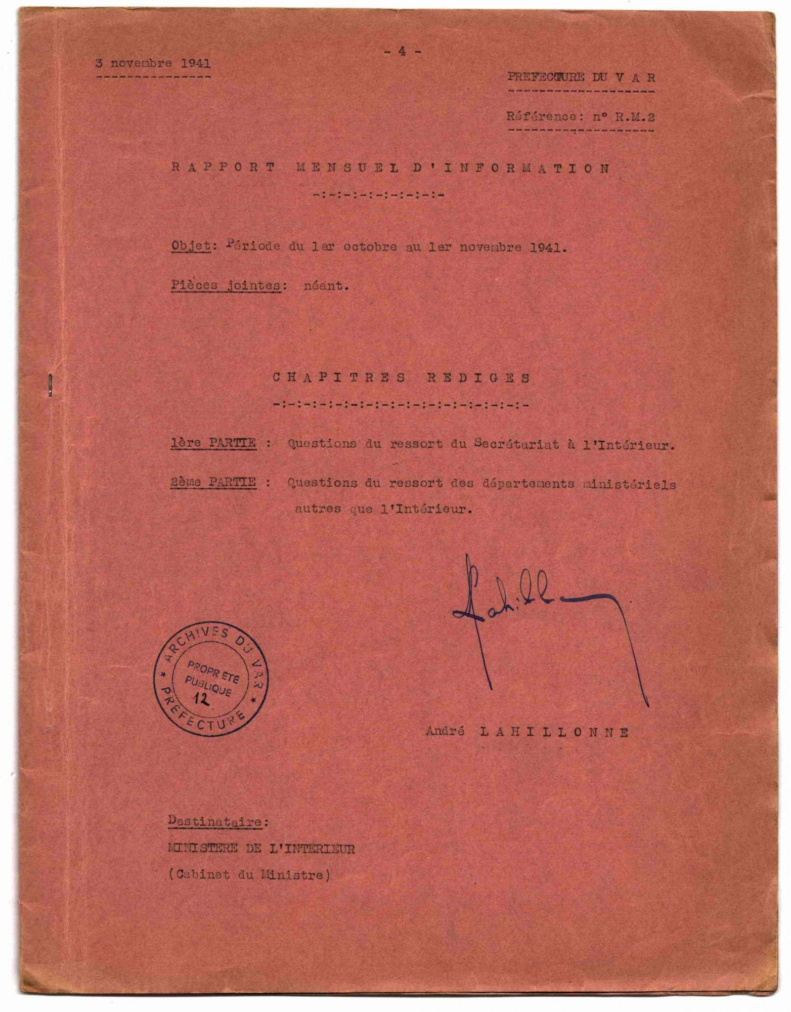 Rapport du préfet du Var au ministre de l'Intérieur sur la situation morale du département du Var en octobre 1941 Rapport du préfet du Var au ministre de l'Intérieur sur la situation morale du département du Var en octobre 1941 23
