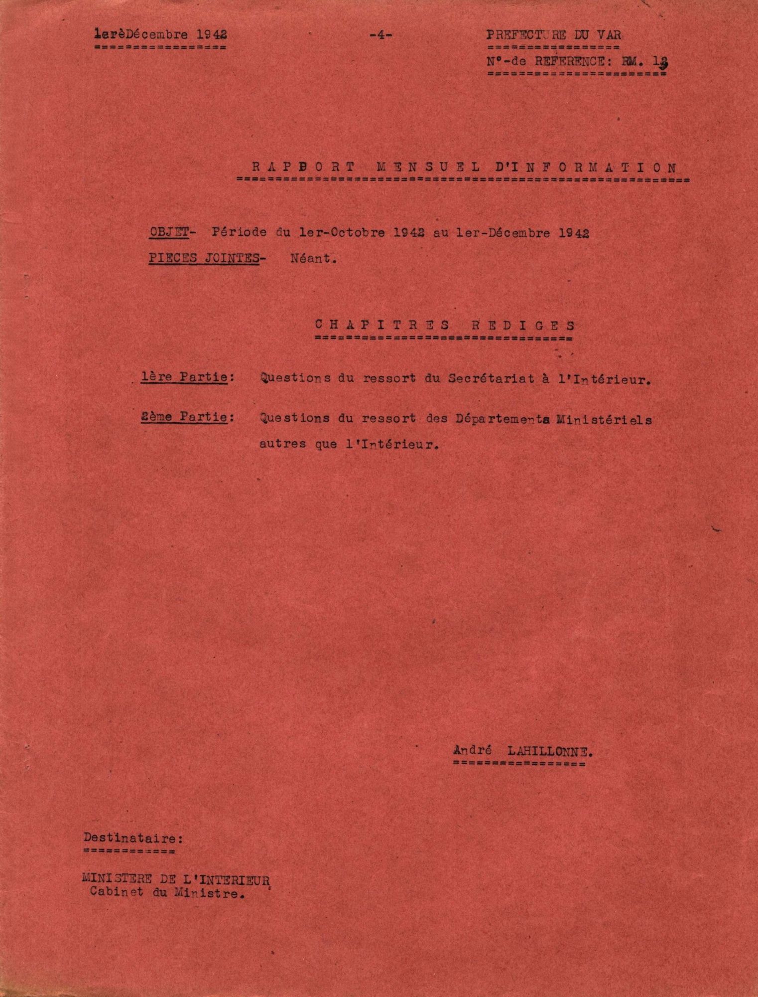 Rapport du préfet du Var au ministre de l'Intérieur sur la situation morale du département du Var en octobre et novembre 1942 Rapport du préfet du Var au ministre de l'Intérieur sur la situation morale du département du Var en octobre et novembre 1942 37