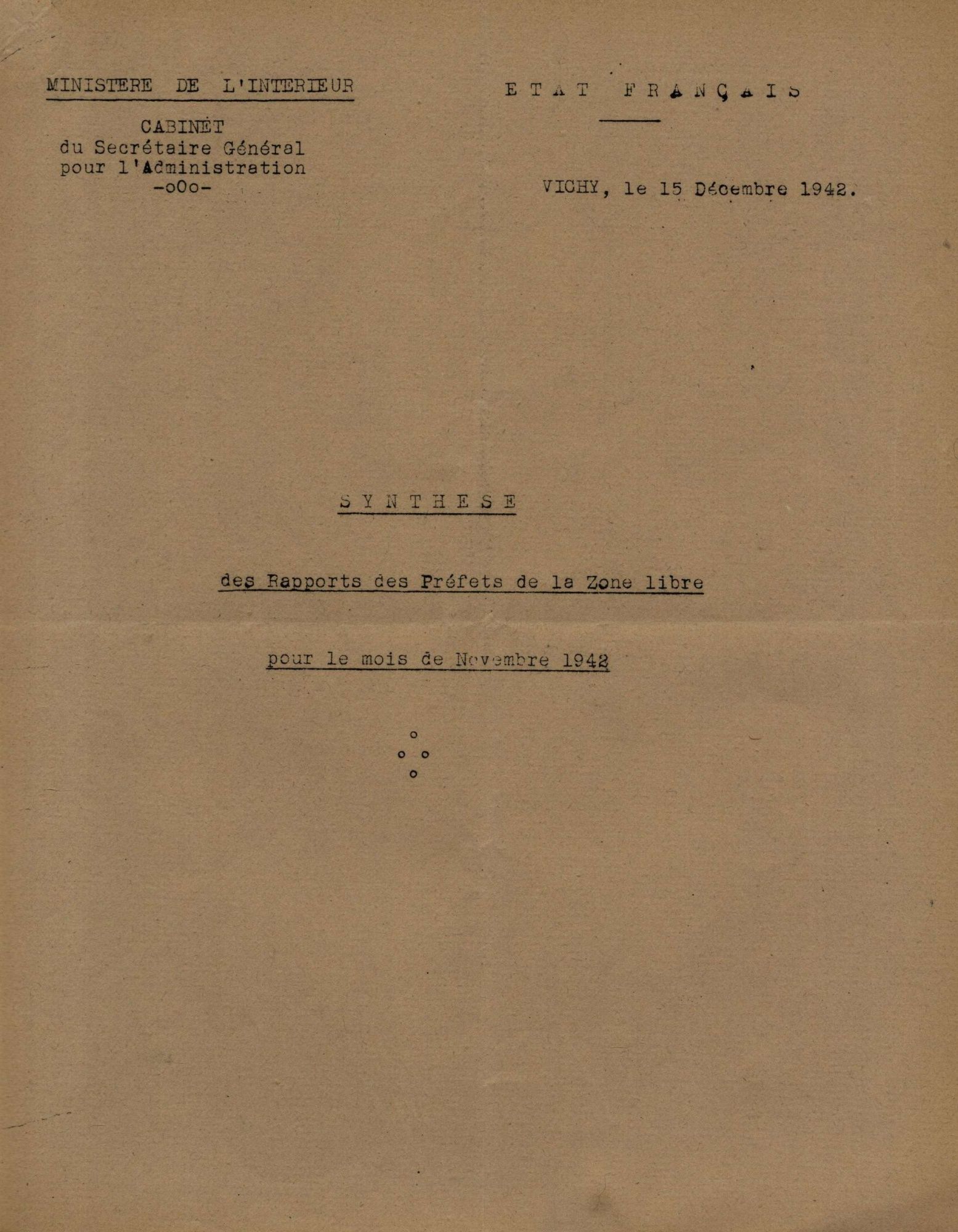Synthèse des rapports mensuels des préfets de la zone libre au ministre de l'Intérieur (novembre 1942) Synthèse des rapports mensuels des préfets de la zone libre au ministre de l'Intérieur (novembre 1942) 7