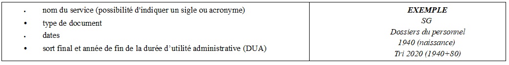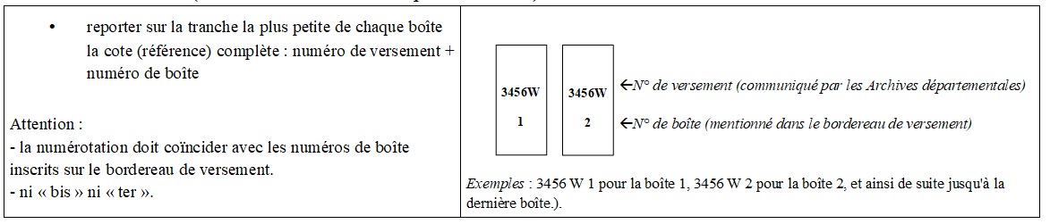 Attention : les boîtes de 20 cm de large et les cartons ne sont plus acceptés pour les versements.Si les documents ne sont pas déjà conditionnés, il est conseillé d'attendre la pré-validation du bordereau pour mettre vos dossiers dans les boîtes d'archives.