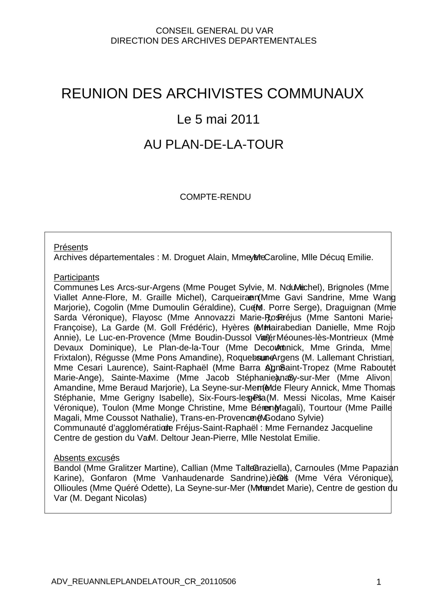 La réunion d'information et d'échange proposée par les Archives départementales à l'attention des archivistes varois s'est déroulée cette année au Plan-de-la-Tour. Cette commune s'investit depuis de nombreuses années dans le classement de ses archives et a récemment aménagé un local d'archivage. Une quarantaine d'archivistes et de correspondants archives se sont retrouvés, le 5 mai dernier, dans la salle du foyer Marie Mauron pour partager et échanger informations et expériences.