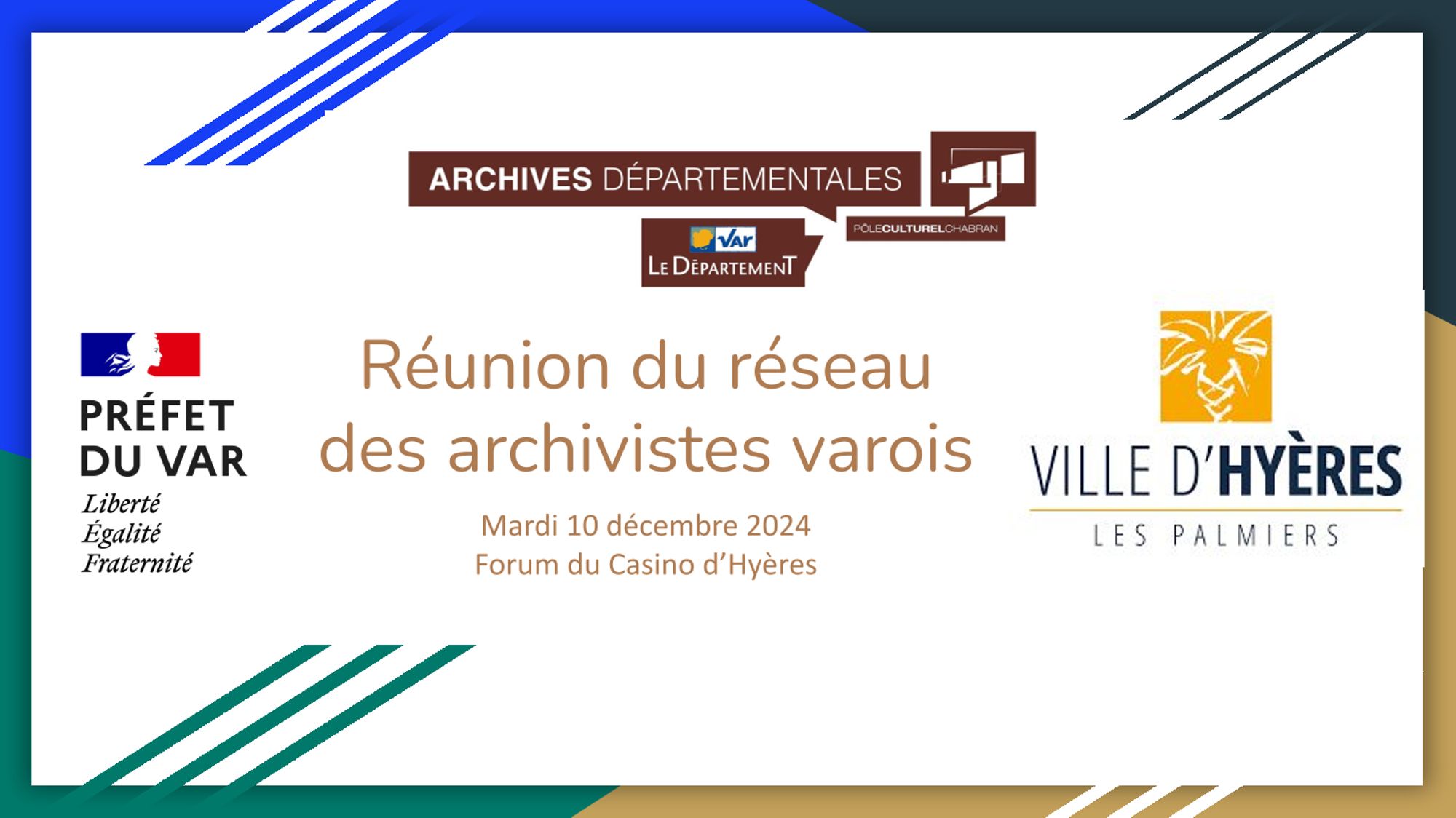 La commune d'Hyères a accueilli le 10 décembre 2024 la réunion annuelle des archivistes communaux et intercommunaux du Var. La cinquantaine de participants a pu échanger sur des sujets d'actualité tels que le droit d'accès aux archives publiques, découvrir l'important travail de collecte et de valorisation mené par les archives municipales de Saint-Raphaël, avant d'assister à la projection d'un film de 1957 “Hyères au pays des îles d’or”, récemment acquis par les Archives municipales d'Hyères, et d'entamer la tradionnelle visite des locaux dédiés aux archives.