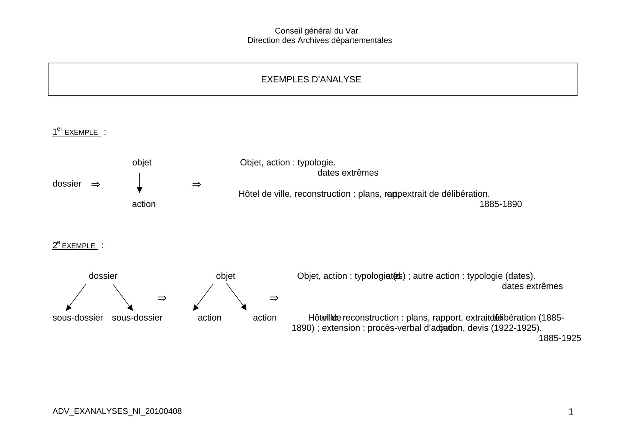 L’analyse archivistique a pour but de donner, sous une forme organisée, concise et précise, les données pertinentes sur le contenu informatif d’un document ou d’un ensemble de documents. Elle doit principalement répondre aux questions suivantes : Quoi ? Comment ? Avec quoi ? Quand ? Il est nécessaire de connaître trois termes : l’objet, l’action et la typologie.