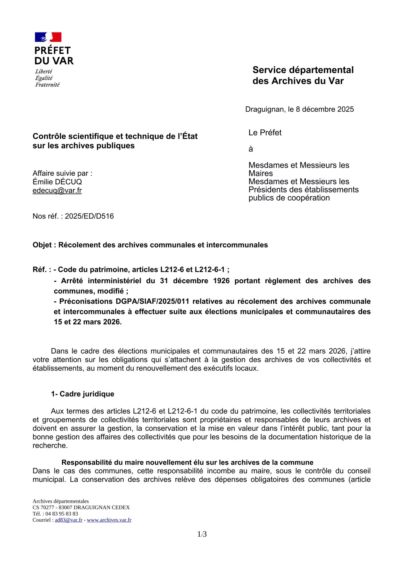 Le procès-verbal de récolement devra être signé par le maire (ou le président de l’E.PC.I.), un exemplaire sera transmis au directeur des Archives départementales du Var.