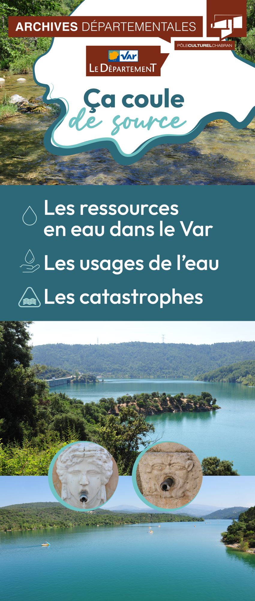 Exposition inaugurale des nouveaux locaux des Archives départementales, en 2015, ça coule de source aborde l'eau en tant que ressource, loisir ou encore risque. A travers des archives de tout le département du Var, provenant de diverses sources : archives communales, iconographiques, ponts et chaussées, etc, on retrouve ce qui fait l'attrait de notre territoire comme lieu de résidence ou de vacances. Avant la seconde moitié du XXe siècle et la généralisation de l'eau courante comme de l'assainissement, la domestication de cette ressource jalonne les villages d'ouvrages d'art et d'architecture : aqueducs, barrages, canaux, fontaines, moulins, majoritairement toujours visibles aujourd'hui.