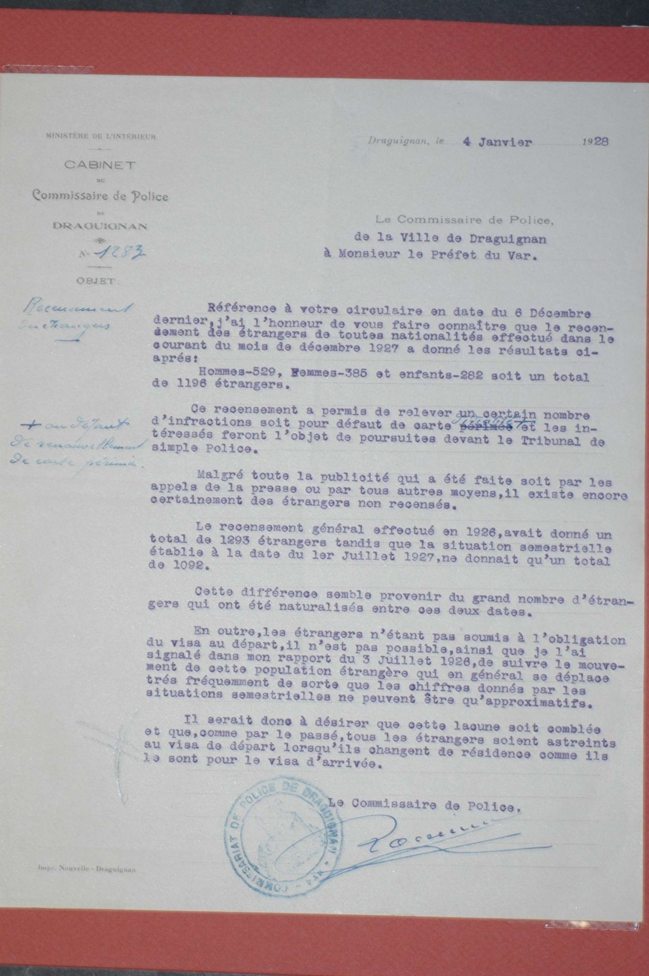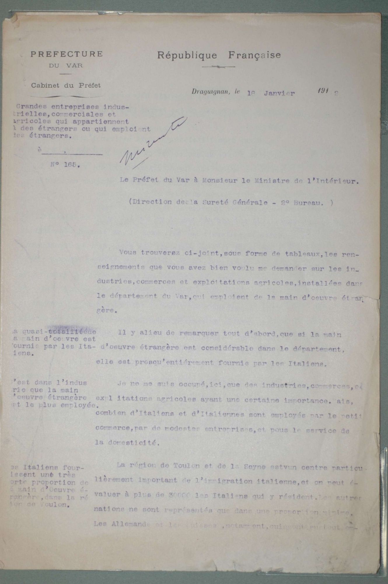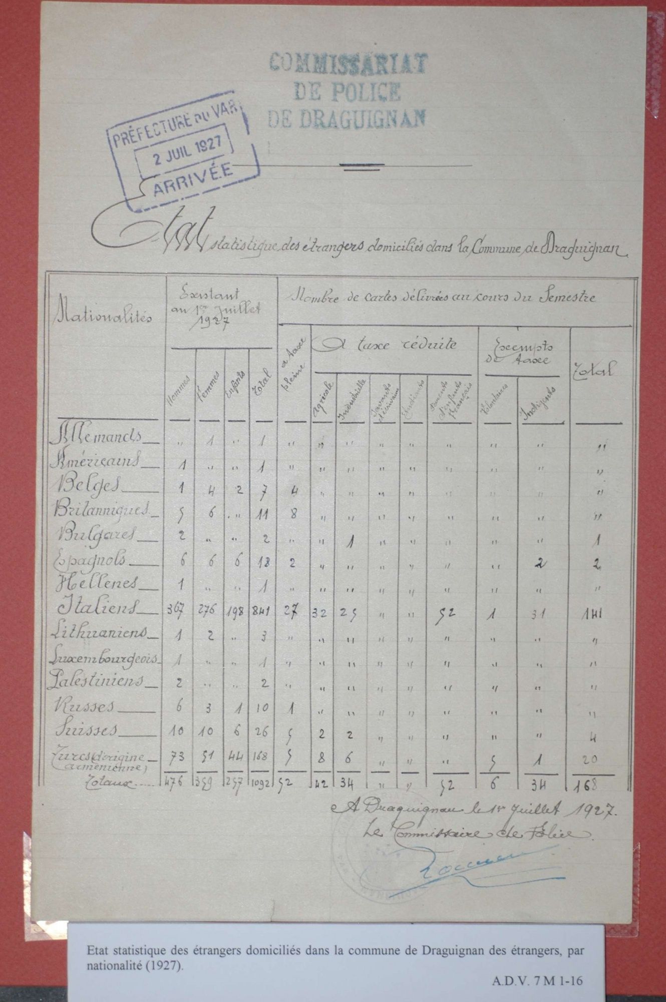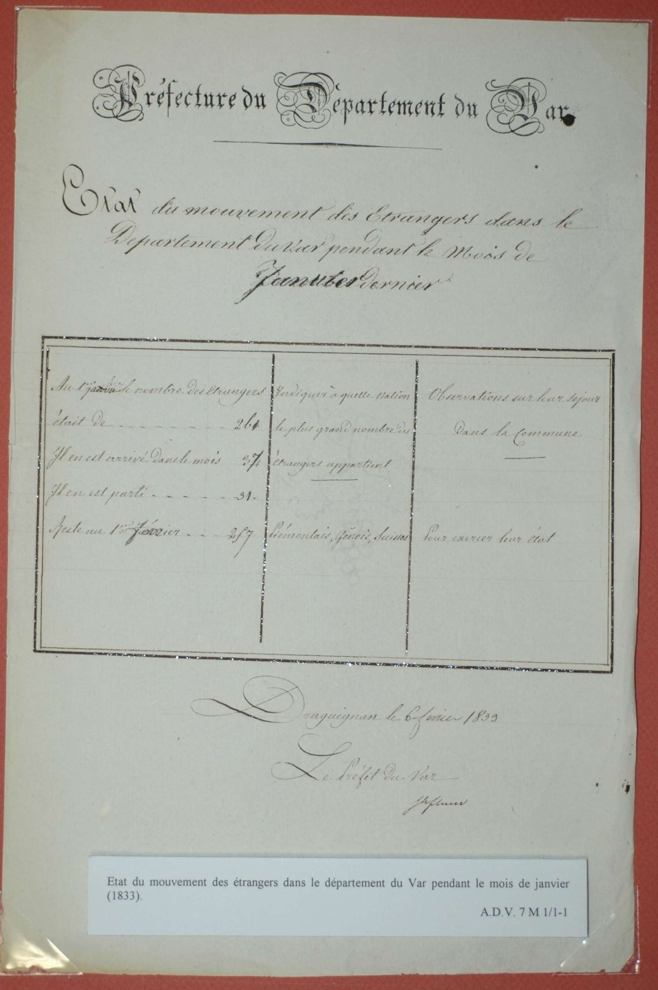 D'ici et d'ailleurs: immigration dans le Var ( XIXe - XXe siècles) D'ici et d'ailleurs: immigration dans le Var ( XIXe - XXe siècles) - Demande de naturalisation (1931) 1 D'ici et d'ailleurs: immigration dans le Var ( XIXe - XXe siècles) - Minute d'un rapport préfectoral au ministère de l'intérieur (1912) 1 D'ici et d'ailleurs: immigration dans le Var ( XIXe - XXe siècles) - Vie associative La Seyne sur Mer (1912) 1 D'ici et d'ailleurs: immigration dans le Var ( XIXe - XXe siècles) - Circulaire préfectorale (1926) 1 D'ici et d'ailleurs: immigration dans le Var ( XIXe - XXe siècles) - La Seyne sur Mer (1881) : Etat des entreprises publiques ou privées employant des ouvriers étrangers 1 D'ici et d'ailleurs: immigration dans le Var ( XIXe - XXe siècles) - Etat nominatif des réfugiés politiques (1938) 1 D'ici et d'ailleurs: immigration dans le Var ( XIXe - XXe siècles) - Procès-verbal de la séance ordinaire de la Chambre consultative d'agriculture (1858) 1 D'ici et d'ailleurs: immigration dans le Var ( XIXe - XXe siècles) - Etat des étrangers occupés dans l'agriculture au 1er décembre 1926 1 D'ici et d'ailleurs: immigration dans le Var ( XIXe - XXe siècles) - Récépissés de demande ou de renouvellement de carte d'identité (1941-1945) 1 D'ici et d'ailleurs: immigration dans le Var ( XIXe - XXe siècles) - Etat récapitulatif des séjours des étrangers , arrondissement de Toulon (1er semestre 1907) 1 D'ici et d'ailleurs: immigration dans le Var ( XIXe - XXe siècles) - Mouvement des étrangers dans l'arrondissement de Toulon (novembre 1856) 1 D'ici et d'ailleurs: immigration dans le Var ( XIXe - XXe siècles) - Etat des étrangers domiciliés sur la commune de Draguignan, par nationalité. (1927) 1 D'ici et d'ailleurs: immigration dans le Var ( XIXe - XXe siècles) - Mouvement des étrangers dans le département du Var pendant le mois de janvier 1833. 1 D'ici et d'ailleurs: immigration dans le Var ( XIXe - XXe siècles) - Recensement des étrangers en résidence à Draguignan en décembre 1927 (1928) 1 D'ici et d'ailleurs: immigration dans le Var ( XIXe - XXe siècles) - Rapport sur la colonie musulmane de la région de Toulon (1961) 1 D'ici et d'ailleurs: immigration dans le Var ( XIXe - XXe siècles) - Rapport sur les Nord-Africains (Algériens) dans le secteur de Toulon (1954). 1 D'ici et d'ailleurs: immigration dans le Var ( XIXe - XXe siècles) - Article relatif aux travailleurs étrangers, nord-africains et italiens ( Le méridional, 17 mars 1971) 1 D'ici et d'ailleurs: immigration dans le Var ( XIXe - XXe siècles) - Circulaire relative à l'attribution d'un prénom arabe aux enfants nés en France et issus de musulmans (1943) 1 D'ici et d'ailleurs: immigration dans le Var ( XIXe - XXe siècles) - Lettre du procureur de la République au juge de paix de Callas relative au mariage des étrangers (1942) 1 D'ici et d'ailleurs: immigration dans le Var ( XIXe - XXe siècles) - Circulaire du ministère du travail relative au mariage entre indochinois et femmes françaises (1943) 1 D'ici et d'ailleurs: immigration dans le Var ( XIXe - XXe siècles) - Fiche individuelle de dénombrement des étrangers sans nationalité et des étrangers bénéficiaires du droit d'asile 1 D'ici et d'ailleurs: immigration dans le Var ( XIXe - XXe siècles) - Récépissé de demande de carte d'invalidité de travailleur agricole 1 D'ici et d'ailleurs: immigration dans le Var ( XIXe - XXe siècles) - Article relatif aux étrangers à Brignoles (Le Méridional, 14 avril 1970) 1 D'ici et d'ailleurs: immigration dans le Var ( XIXe - XXe siècles) - Article relatif aux étrangers à Toulon (Le Méridional, 12 juin 1969) 1 D'ici et d'ailleurs: immigration dans le Var ( XIXe - XXe siècles) - Article relatif aux étrangers à Toulon (Le Méridional, 11 juin 1969) 1 D'ici et d'ailleurs: immigration dans le Var ( XIXe - XXe siècles) - Article relatif aux étrangers à Toulon et à La Valette (Le Méridional, 16 décembre 1967) 1 D'ici et d'ailleurs: immigration dans le Var ( XIXe - XXe siècles) - Plaquette éditée par la Préfecture du Var "Les immigrés dans le département du Var" (1978) 1 D'ici et d'ailleurs: immigration dans le Var ( XIXe - XXe siècles) - Registre des visas accordés par la commune de Barjols (1930-1934) 1 D'ici et d'ailleurs: immigration dans le Var ( XIXe - XXe siècles) - Affiche de l'exposition (2010) 1 D'ici et d'ailleurs: immigration dans le Var ( XIXe - XXe siècles) - Ouvrages présentés lors de l'exposition (2010) 1