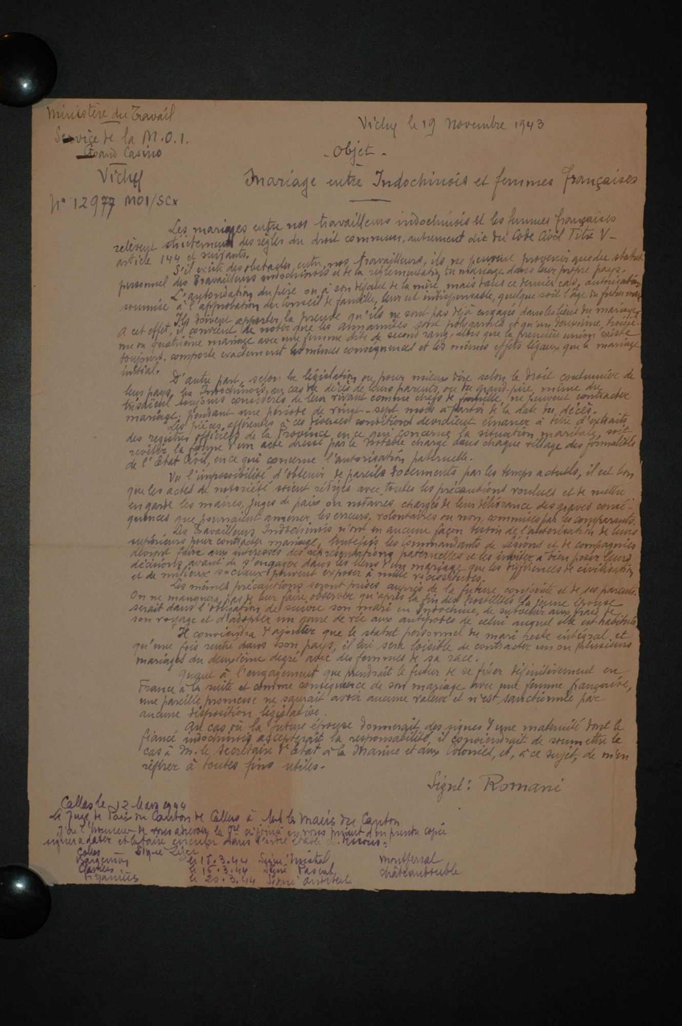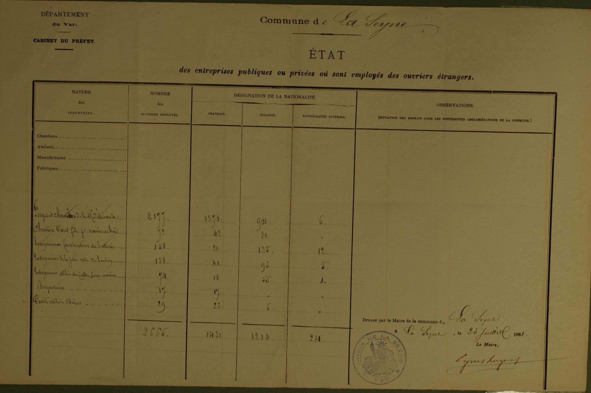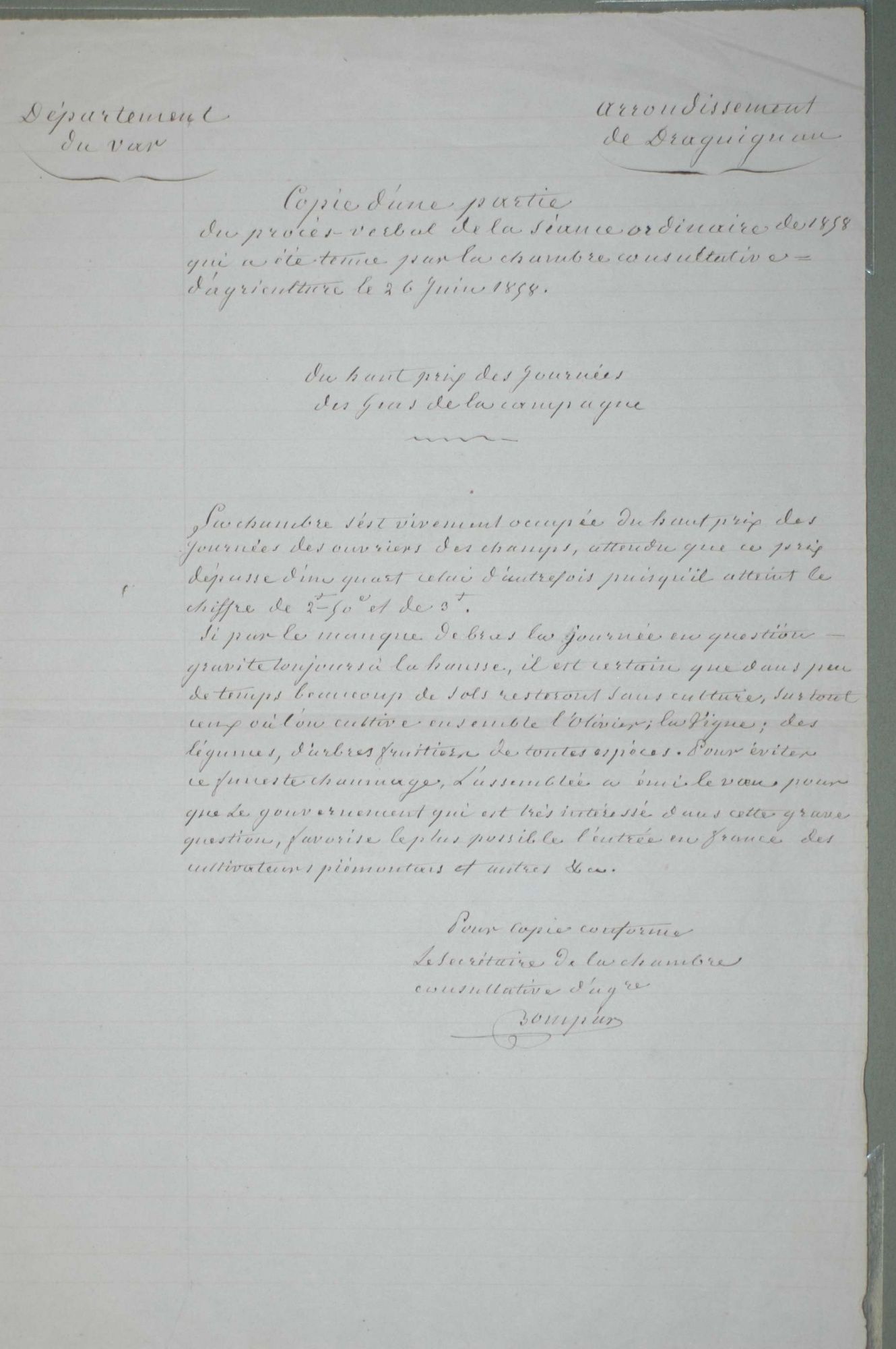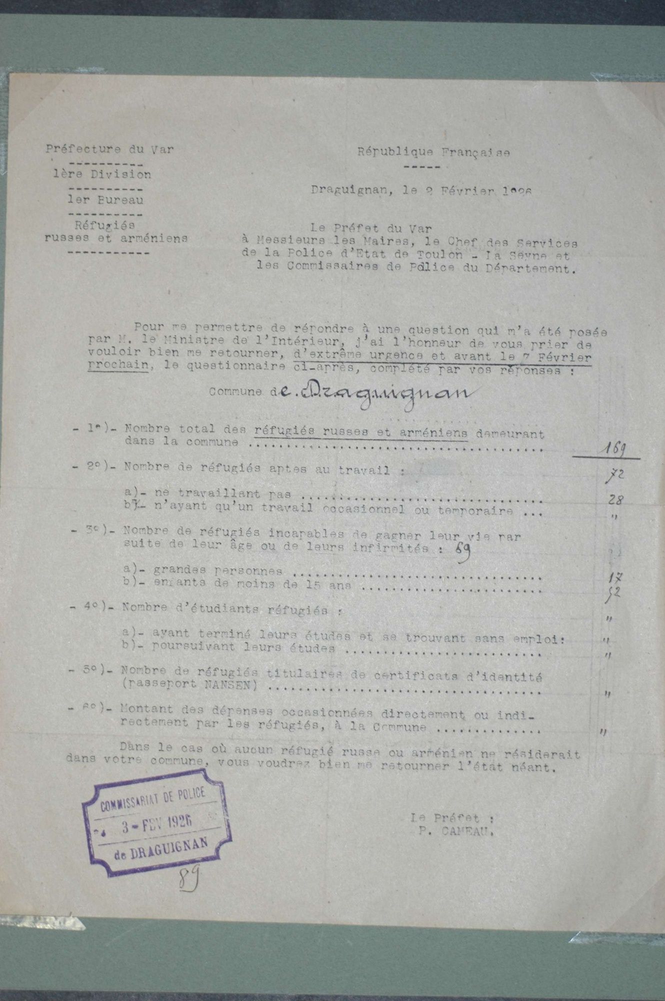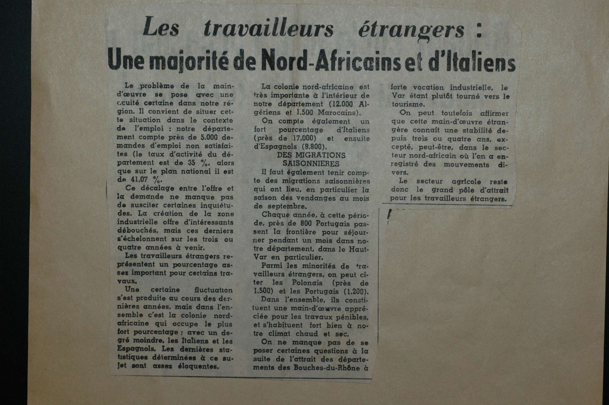 D'ici et d'ailleurs: immigration dans le Var ( XIXe - XXe siècles) D'ici et d'ailleurs: immigration dans le Var ( XIXe - XXe siècles) - Demande de naturalisation (1931) 1 D'ici et d'ailleurs: immigration dans le Var ( XIXe - XXe siècles) - Minute d'un rapport préfectoral au ministère de l'intérieur (1912) 1 D'ici et d'ailleurs: immigration dans le Var ( XIXe - XXe siècles) - Vie associative La Seyne sur Mer (1912) 1 D'ici et d'ailleurs: immigration dans le Var ( XIXe - XXe siècles) - Circulaire préfectorale (1926) 1 D'ici et d'ailleurs: immigration dans le Var ( XIXe - XXe siècles) - La Seyne sur Mer (1881) : Etat des entreprises publiques ou privées employant des ouvriers étrangers 1 D'ici et d'ailleurs: immigration dans le Var ( XIXe - XXe siècles) - Etat nominatif des réfugiés politiques (1938) 1 D'ici et d'ailleurs: immigration dans le Var ( XIXe - XXe siècles) - Procès-verbal de la séance ordinaire de la Chambre consultative d'agriculture (1858) 1 D'ici et d'ailleurs: immigration dans le Var ( XIXe - XXe siècles) - Etat des étrangers occupés dans l'agriculture au 1er décembre 1926 1 D'ici et d'ailleurs: immigration dans le Var ( XIXe - XXe siècles) - Récépissés de demande ou de renouvellement de carte d'identité (1941-1945) 1 D'ici et d'ailleurs: immigration dans le Var ( XIXe - XXe siècles) - Etat récapitulatif des séjours des étrangers , arrondissement de Toulon (1er semestre 1907) 1 D'ici et d'ailleurs: immigration dans le Var ( XIXe - XXe siècles) - Mouvement des étrangers dans l'arrondissement de Toulon (novembre 1856) 1 D'ici et d'ailleurs: immigration dans le Var ( XIXe - XXe siècles) - Etat des étrangers domiciliés sur la commune de Draguignan, par nationalité. (1927) 1 D'ici et d'ailleurs: immigration dans le Var ( XIXe - XXe siècles) - Mouvement des étrangers dans le département du Var pendant le mois de janvier 1833. 1 D'ici et d'ailleurs: immigration dans le Var ( XIXe - XXe siècles) - Recensement des étrangers en résidence à Draguignan en décembre 1927 (1928) 1 D'ici et d'ailleurs: immigration dans le Var ( XIXe - XXe siècles) - Rapport sur la colonie musulmane de la région de Toulon (1961) 1 D'ici et d'ailleurs: immigration dans le Var ( XIXe - XXe siècles) - Rapport sur les Nord-Africains (Algériens) dans le secteur de Toulon (1954). 1 D'ici et d'ailleurs: immigration dans le Var ( XIXe - XXe siècles) - Article relatif aux travailleurs étrangers, nord-africains et italiens ( Le méridional, 17 mars 1971) 1 D'ici et d'ailleurs: immigration dans le Var ( XIXe - XXe siècles) - Circulaire relative à l'attribution d'un prénom arabe aux enfants nés en France et issus de musulmans (1943) 1 D'ici et d'ailleurs: immigration dans le Var ( XIXe - XXe siècles) - Lettre du procureur de la République au juge de paix de Callas relative au mariage des étrangers (1942) 1 D'ici et d'ailleurs: immigration dans le Var ( XIXe - XXe siècles) - Circulaire du ministère du travail relative au mariage entre indochinois et femmes françaises (1943) 1 D'ici et d'ailleurs: immigration dans le Var ( XIXe - XXe siècles) - Fiche individuelle de dénombrement des étrangers sans nationalité et des étrangers bénéficiaires du droit d'asile 1 D'ici et d'ailleurs: immigration dans le Var ( XIXe - XXe siècles) - Récépissé de demande de carte d'invalidité de travailleur agricole 1 D'ici et d'ailleurs: immigration dans le Var ( XIXe - XXe siècles) - Article relatif aux étrangers à Brignoles (Le Méridional, 14 avril 1970) 1 D'ici et d'ailleurs: immigration dans le Var ( XIXe - XXe siècles) - Article relatif aux étrangers à Toulon (Le Méridional, 12 juin 1969) 1 D'ici et d'ailleurs: immigration dans le Var ( XIXe - XXe siècles) - Article relatif aux étrangers à Toulon (Le Méridional, 11 juin 1969) 1 D'ici et d'ailleurs: immigration dans le Var ( XIXe - XXe siècles) - Article relatif aux étrangers à Toulon et à La Valette (Le Méridional, 16 décembre 1967) 1 D'ici et d'ailleurs: immigration dans le Var ( XIXe - XXe siècles) - Plaquette éditée par la Préfecture du Var "Les immigrés dans le département du Var" (1978) 1 D'ici et d'ailleurs: immigration dans le Var ( XIXe - XXe siècles) - Registre des visas accordés par la commune de Barjols (1930-1934) 1 D'ici et d'ailleurs: immigration dans le Var ( XIXe - XXe siècles) - Affiche de l'exposition (2010) 1 D'ici et d'ailleurs: immigration dans le Var ( XIXe - XXe siècles) - Ouvrages présentés lors de l'exposition (2010) 1
