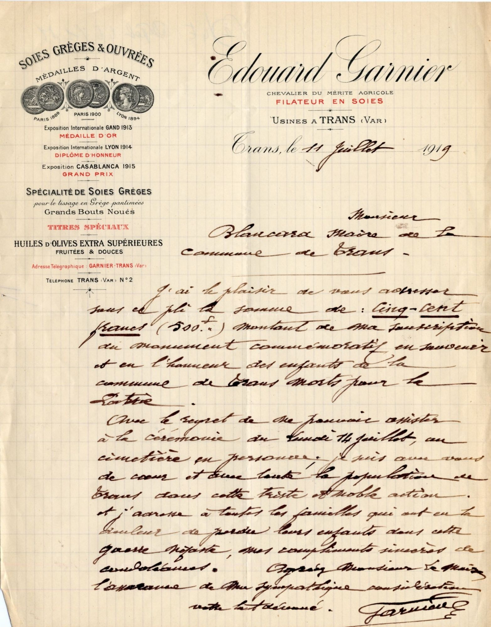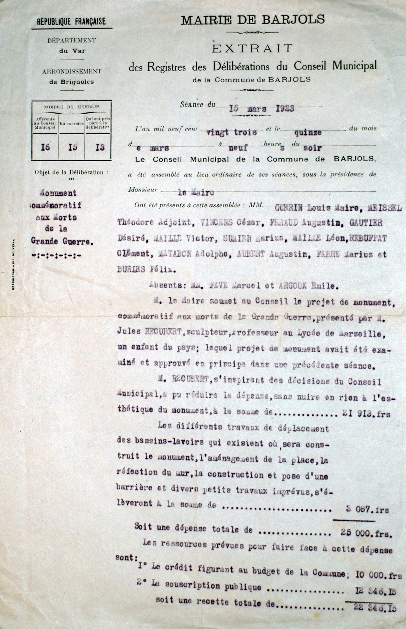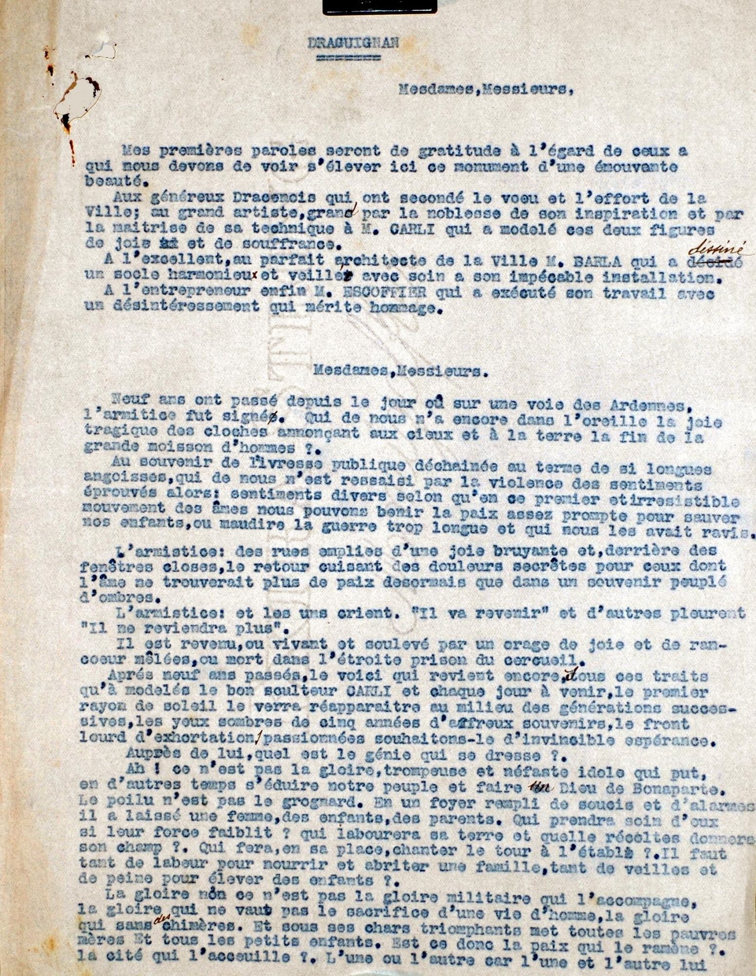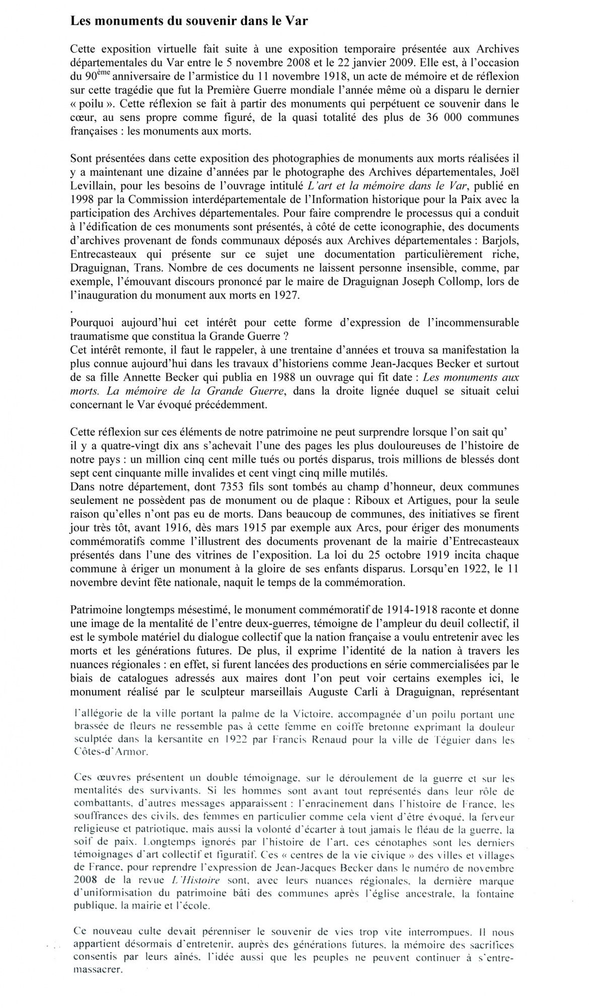 Ce patrimoine de la Grande Guerre est aujourd’hui à découvrir ou à redécouvrir à travers une sélection de documents. Une partie des notices est issue de l'ouvrage de Sylvie Mattone-Vastel et de Georges Meissonnier intitulé : "L'art et la mémoire de 1914-1918 dans le Var".