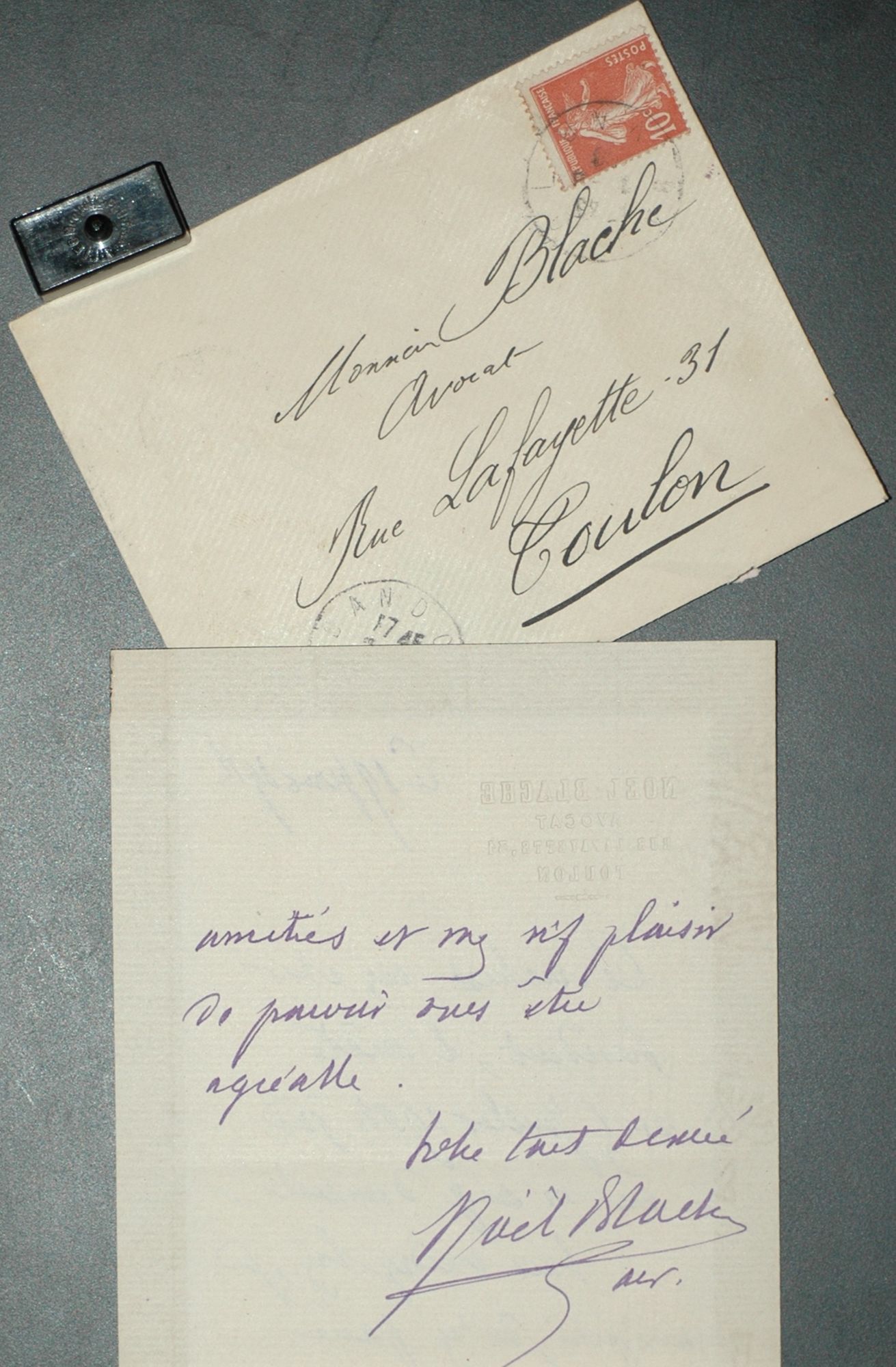 Noël Blache exerça son métier d’avocat à Toulon au 31, rue Lafayette. Nombre de ses affaires personnelles nous ont été rapportées dans des chemises estampillées de son cabinet.