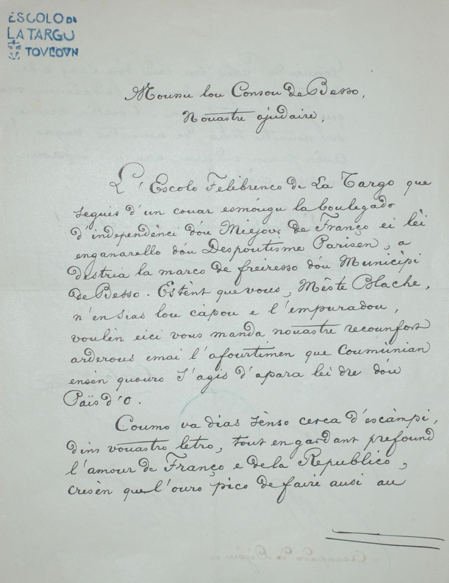Ecrit en provençal ("l'escolo de la Targo" Toulon), adressé à Noël Blache. 71 J 2