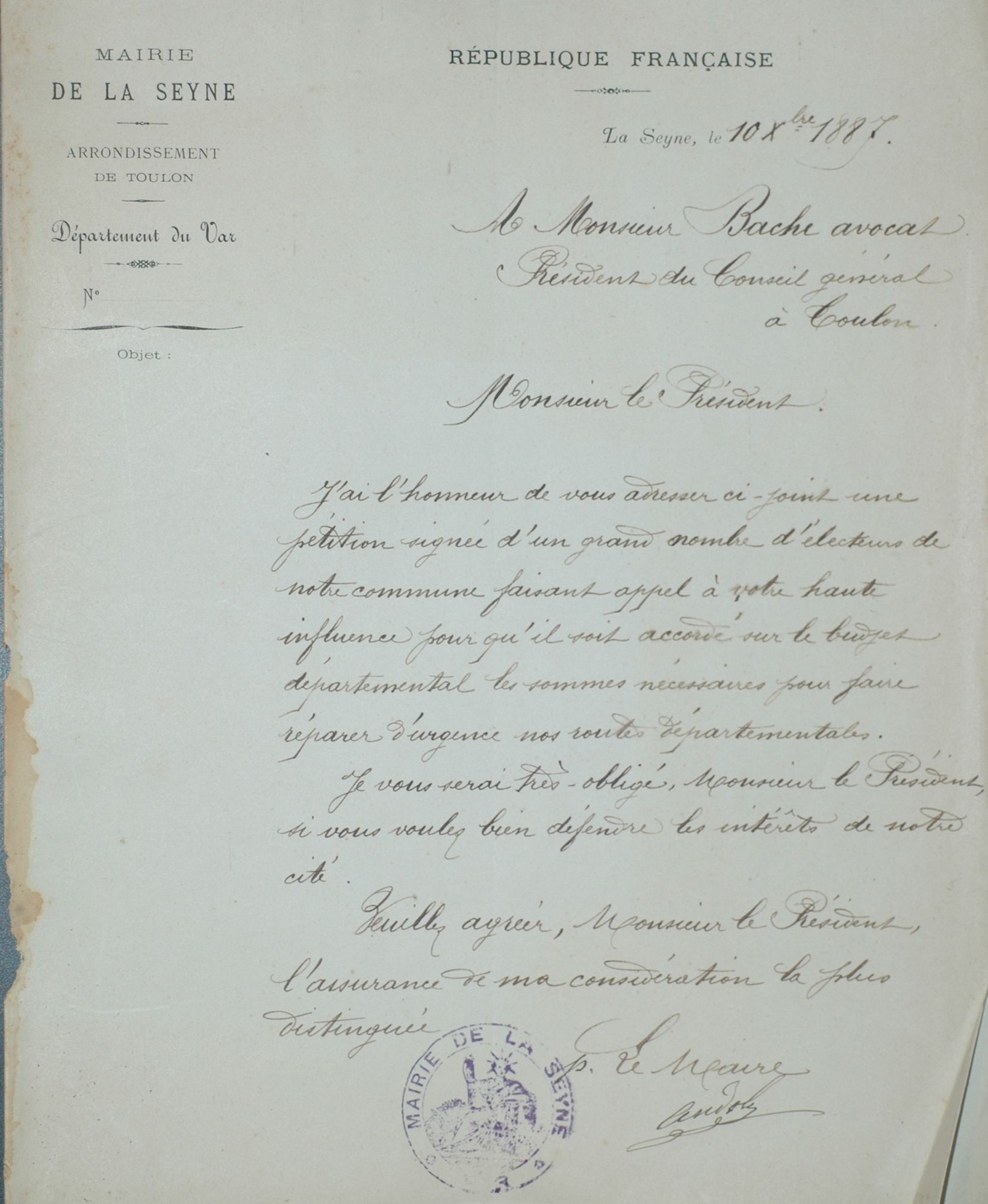 Pétition de Seynois, transmise par la mairie de la Seyne sur mer au président du Conseil général, Noël Blache, relative au déblocage de crédits pour réparer les routes départementales.