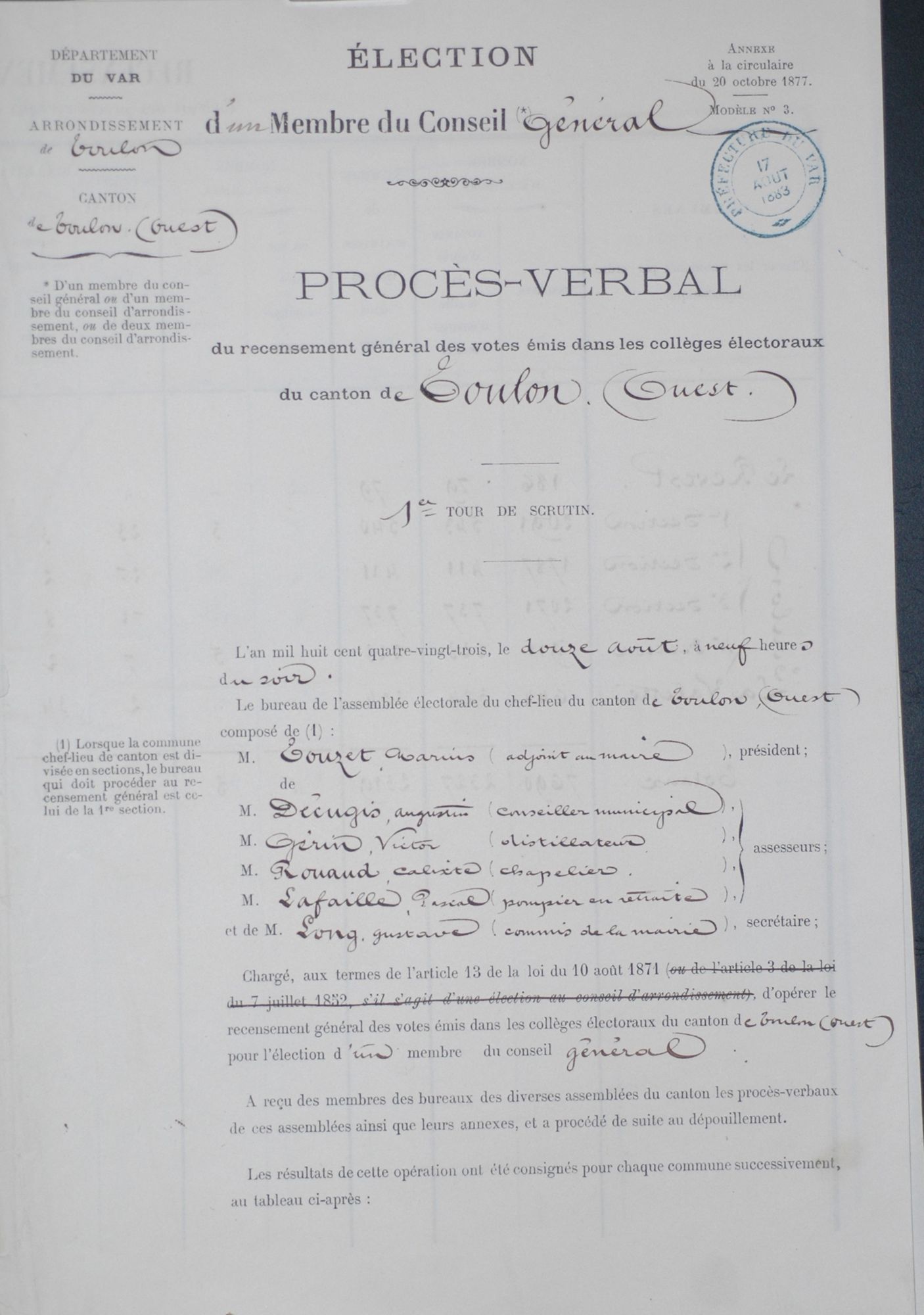 Procès-verbal d'un membre du Conseil général; canton de Toulon ouest. 2 M 5 / 132