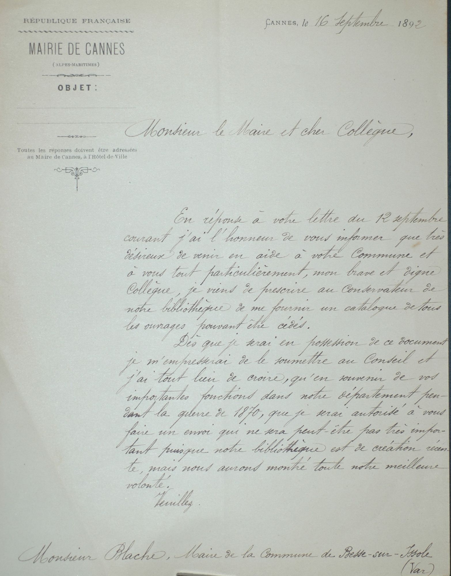 Cette correspondance en témoigne ; il est ici question d'un don d'ouvrages proposé par la mairie de Cannes. 71 J 14