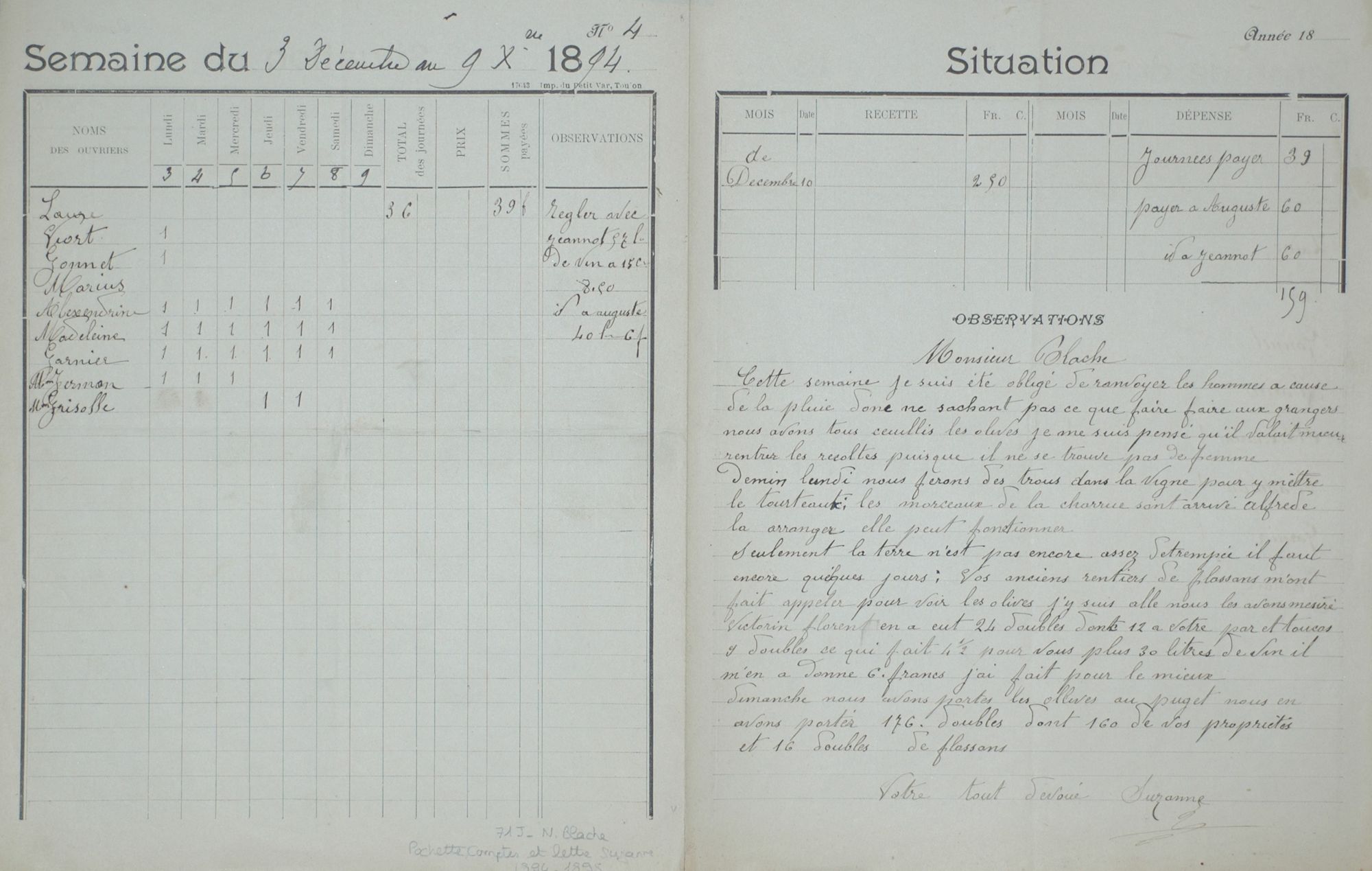 Compte-rendu hebdomadaire du travail des ouvriers intervenant sur le domaine de Noël Blache.