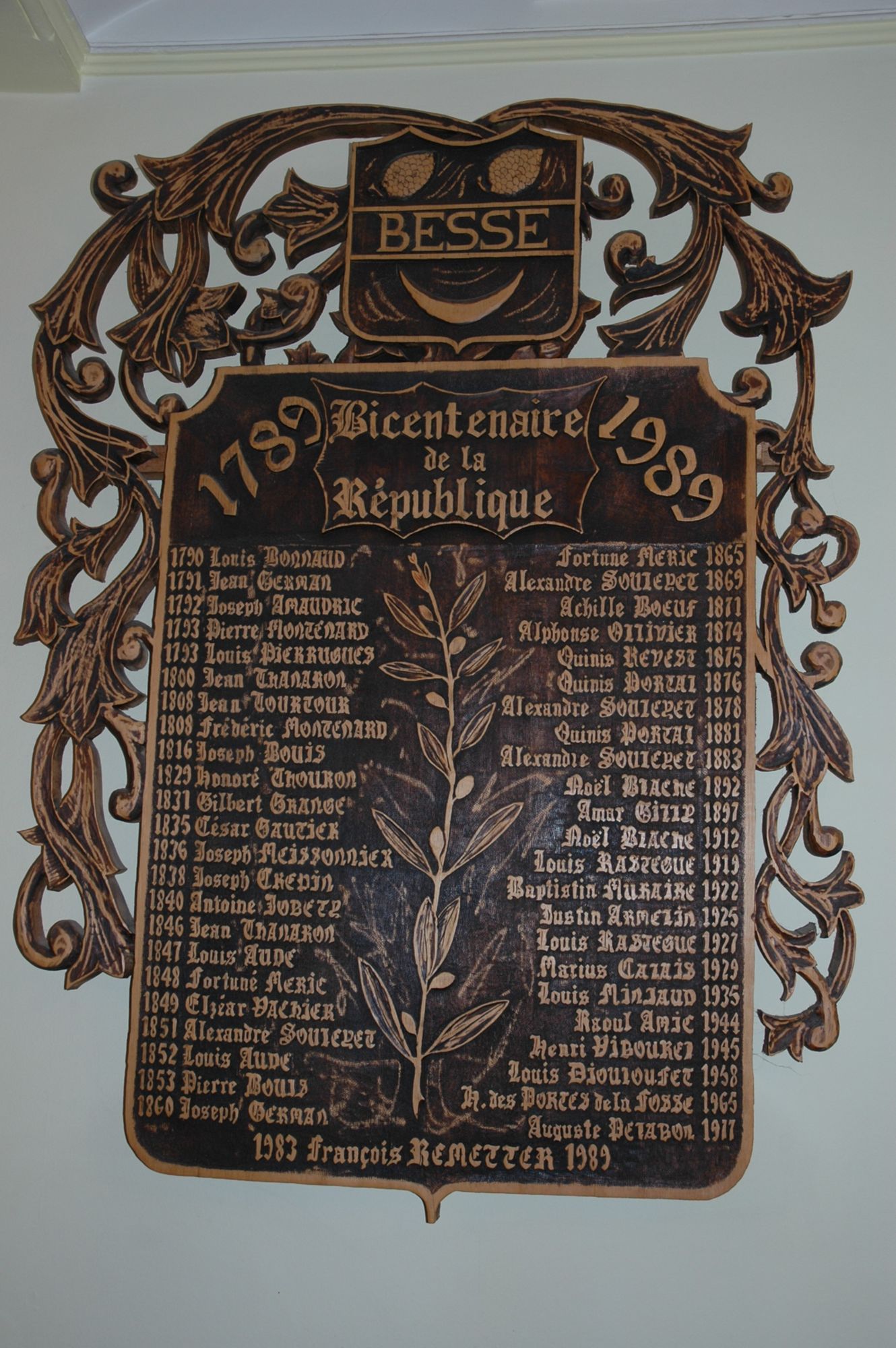 Panneau commémorant le bicentenaire de la Révolution française avec la liste des maires successifs de Besse sur Issole de 1790 à 1989.