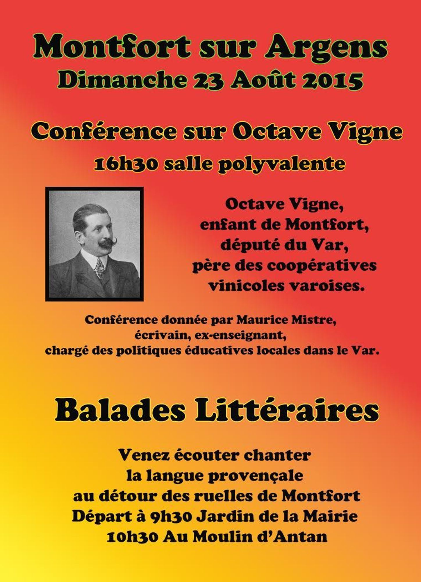 Dimanche 23 août, Maurice Mistre, historien, nous propose une conférence à Montfort-sur-Argens, sur un Octave Vigne, député du Var, père des caves coopératives varoises.
