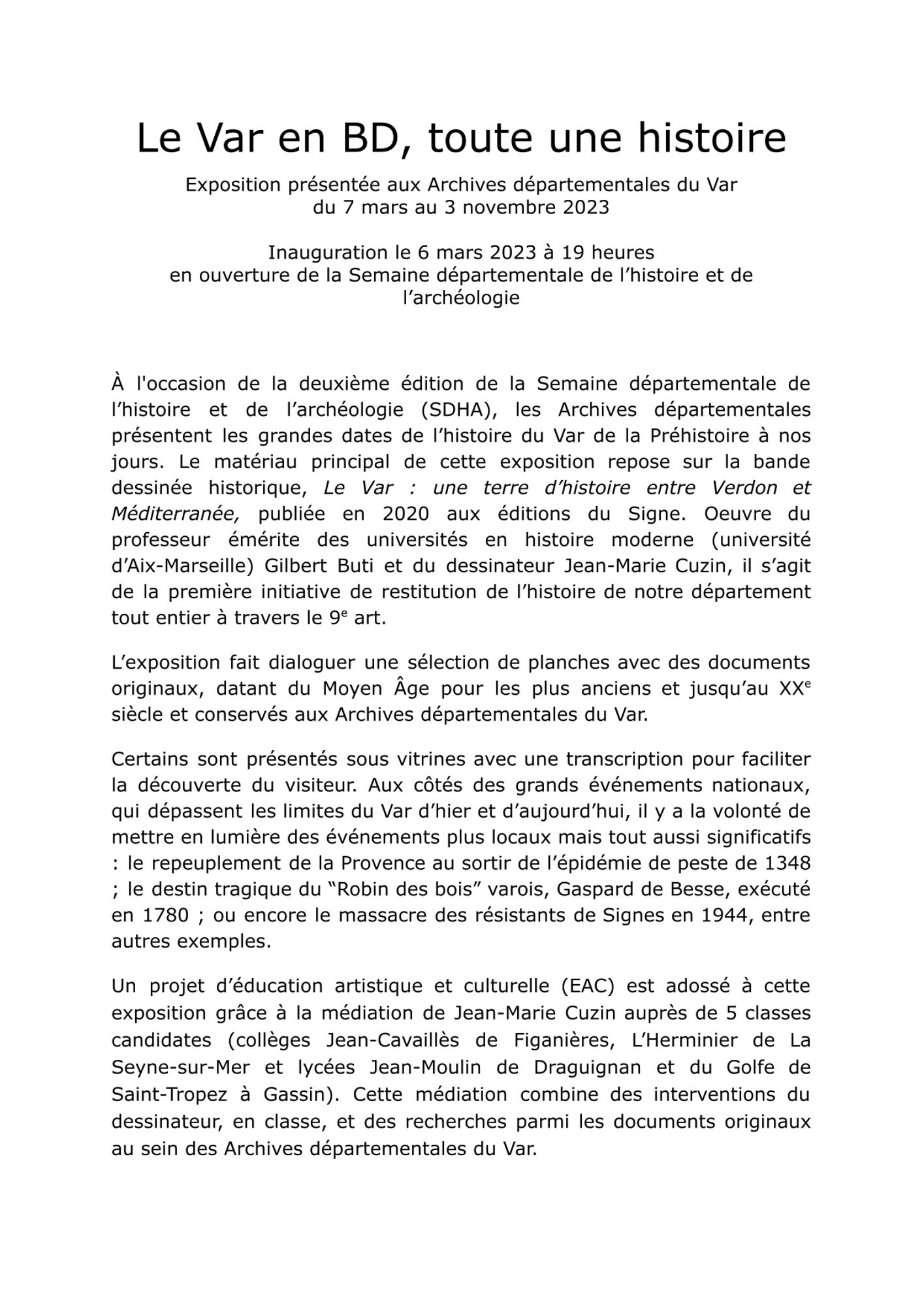 Afin de mettre en valeur ce passé et de le présenter auprès d'un large public, les Archives départementales du Var y consacrent une exposition temporaire en partenariat avec le professeur Gilbert Buti et le dessinateur Jean-Marie Cuzin qui ont récemment publié une bande dessinée sur le sujet, Le Var : une terre d’histoire entre Verdon et Méditerranée.