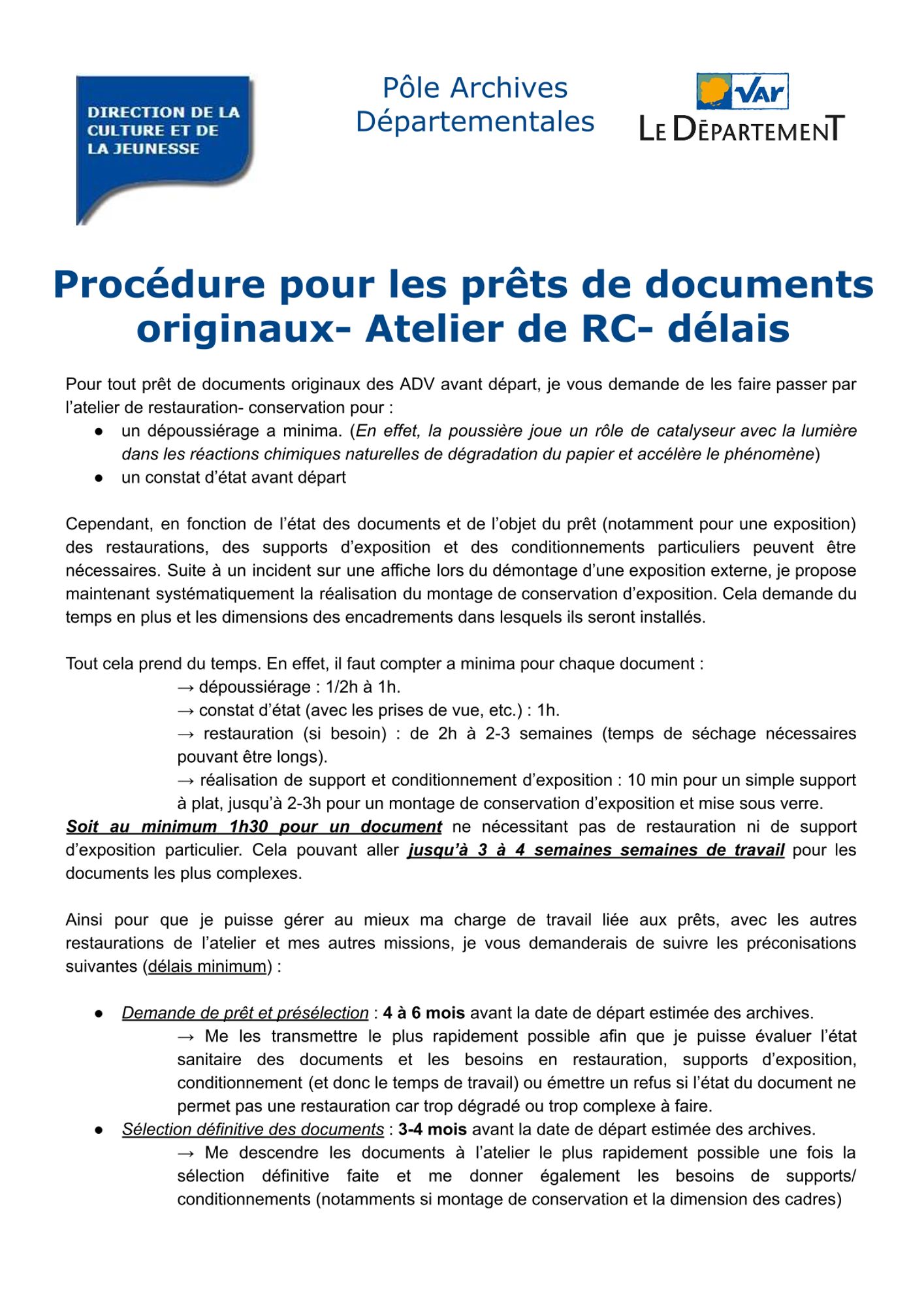 En vue de vous prêter le document dans le meilleur état de conservation tant pour votre exposition que pour sa conversation à long terme, chaque document emprunté passe par le laboratoire de restauration. Parfois un simple dépoussiérage est suffisant, parfois le document était conservé plié, il faut donc le mettre à plat (le temps de mise à plat varie selon le support), parfois une consolidation (doublage, comblement de lacune) est nécessaire. Pour toutes ces raison, un protocole est mis en place afin de respecter ce délai de restauration.